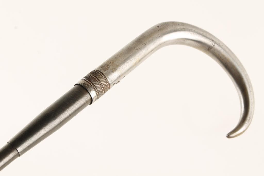 Antique cane gun, .30RF of Continental manufacture with hook needed to cock and all metal construction; ingenious concealment; ca 1870’s. Est.: $1,000-$2,000.