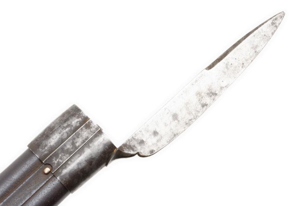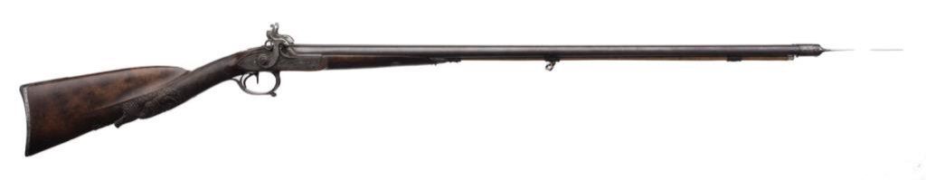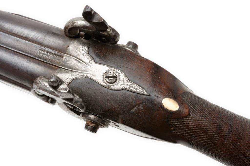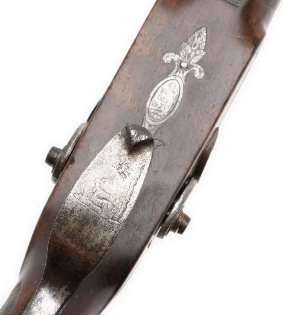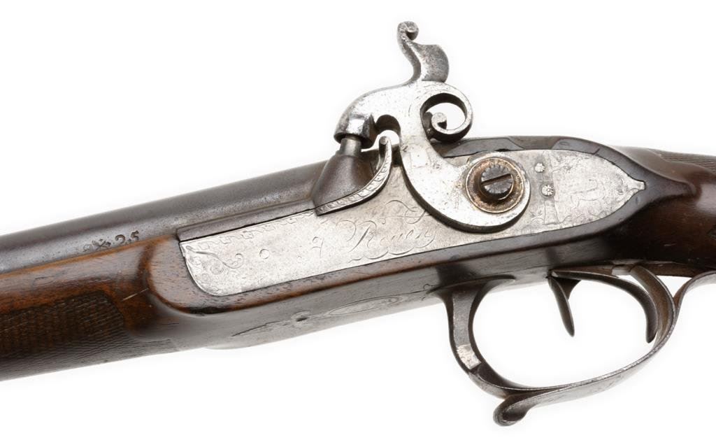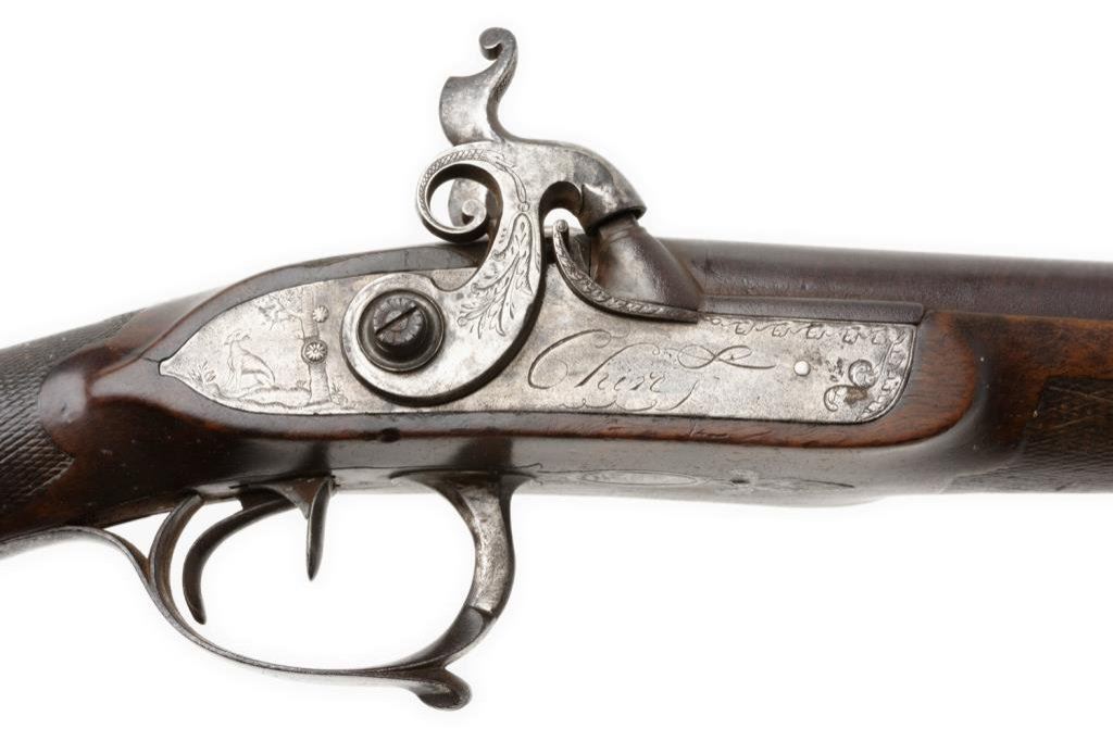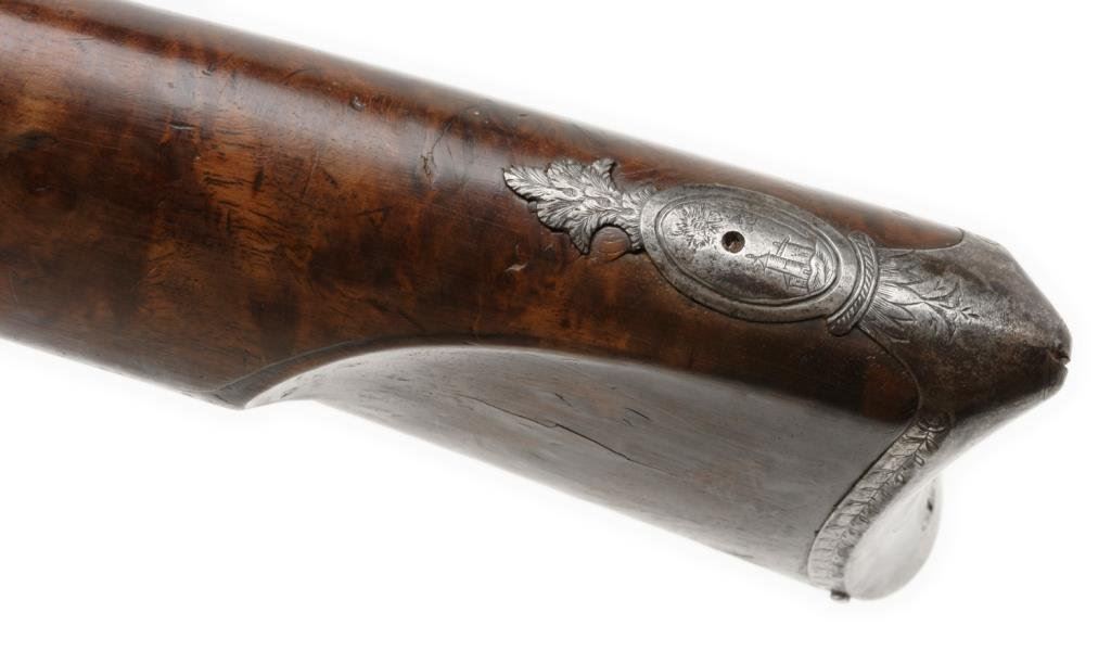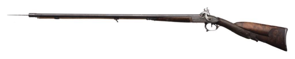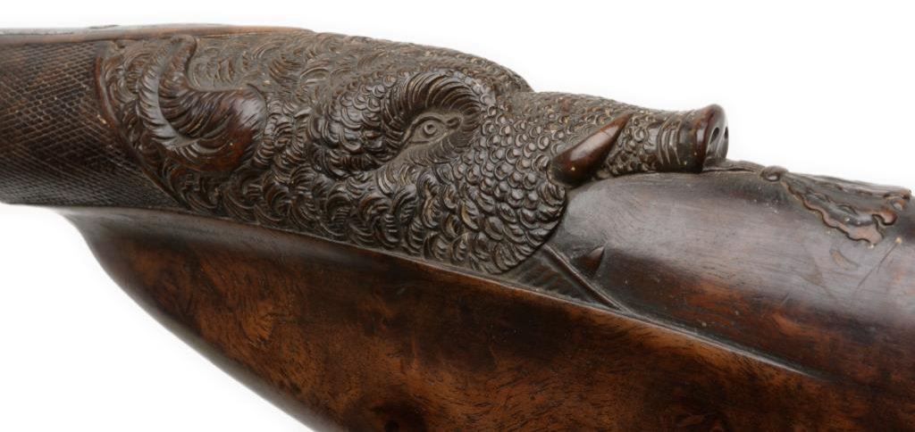 French double barrel rifle converted from flintlock to percussion and signed “Chire in Roven”, ca 1780-1800 and converted ca 1830’s; 20 gauge, 33” barrels, fancy carved stock with bayonet for boar; good to very good condition overall with crisp actions and beautiful burl wood butt stock. The carving at the bottom of the butt stock is finely executed and is the image of a boar’s head. Est.: $1,000-$2,000.