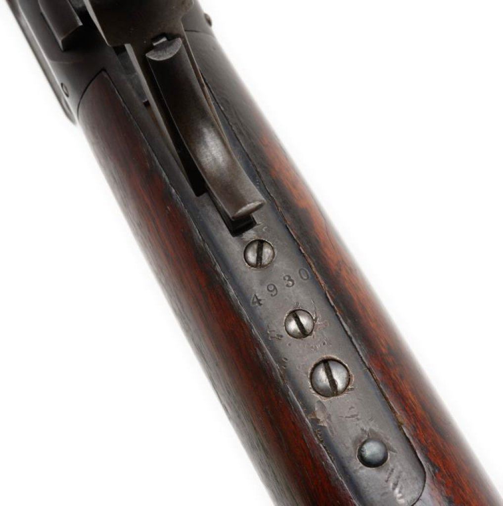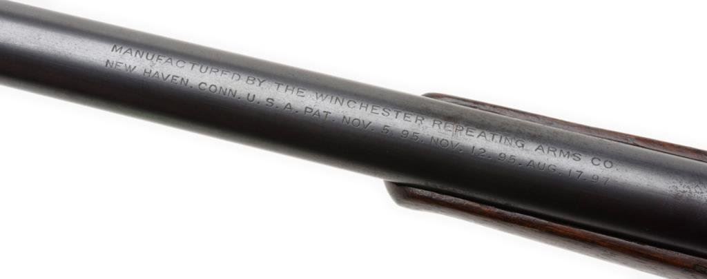 Mechanically important Winchester Model 1895 lever action rifle, .30 US caliber, 28” round barrel, S/N 4930, blued finish, wood stocks in overall very good to near fine condition displaying the majority of its original blue finish on the barrel and considerable original blue finish on the receiver; very good + bore, crisp action and markings, very good + wood stocks. Accompanied by an original factory letter importantly noting “New System”, received in warehouse on November 22, 1897 and shipped from warehouse on the same day to orderr number 23306 with extra notation “Shipped in order of two guns. First marked “New System” in factory records chronologically”. Est.: $1,500-$3,000.