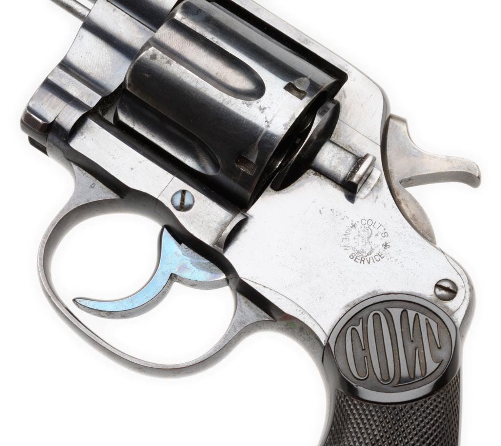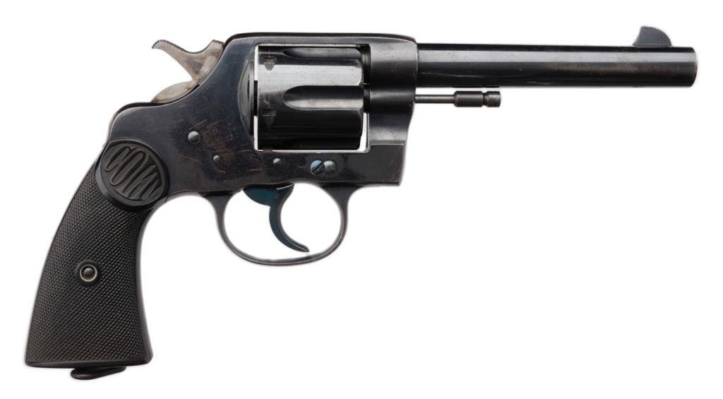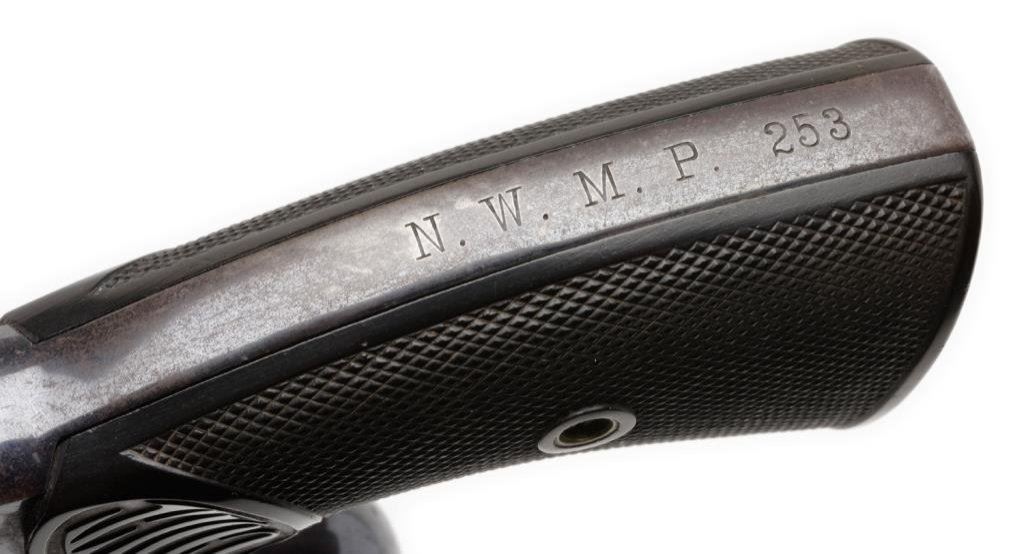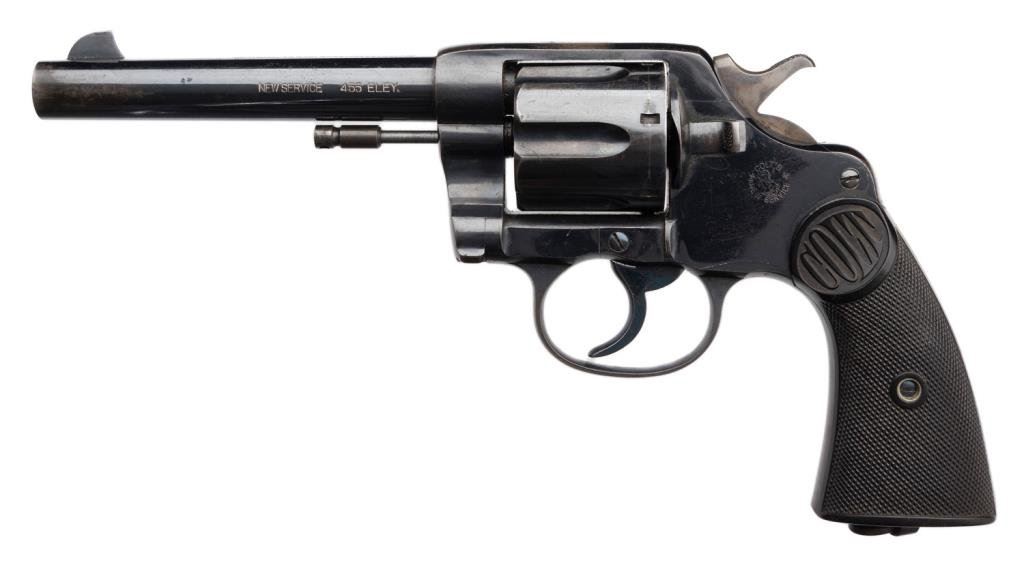**Colt New Service DA revolver, .455 Eley caliber, 5.5” barrel, S/N 11581, blued finish, checkered hard rubber grips, backstrap marked “N.W.M.P. 253” with lanyard ring; in overall fine condition; fine bore, action, markings and grips. No factory letter. Est.: $1,400-$2,800.