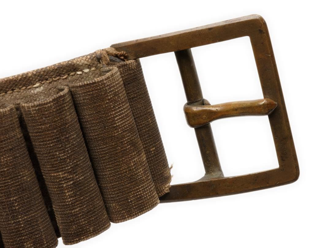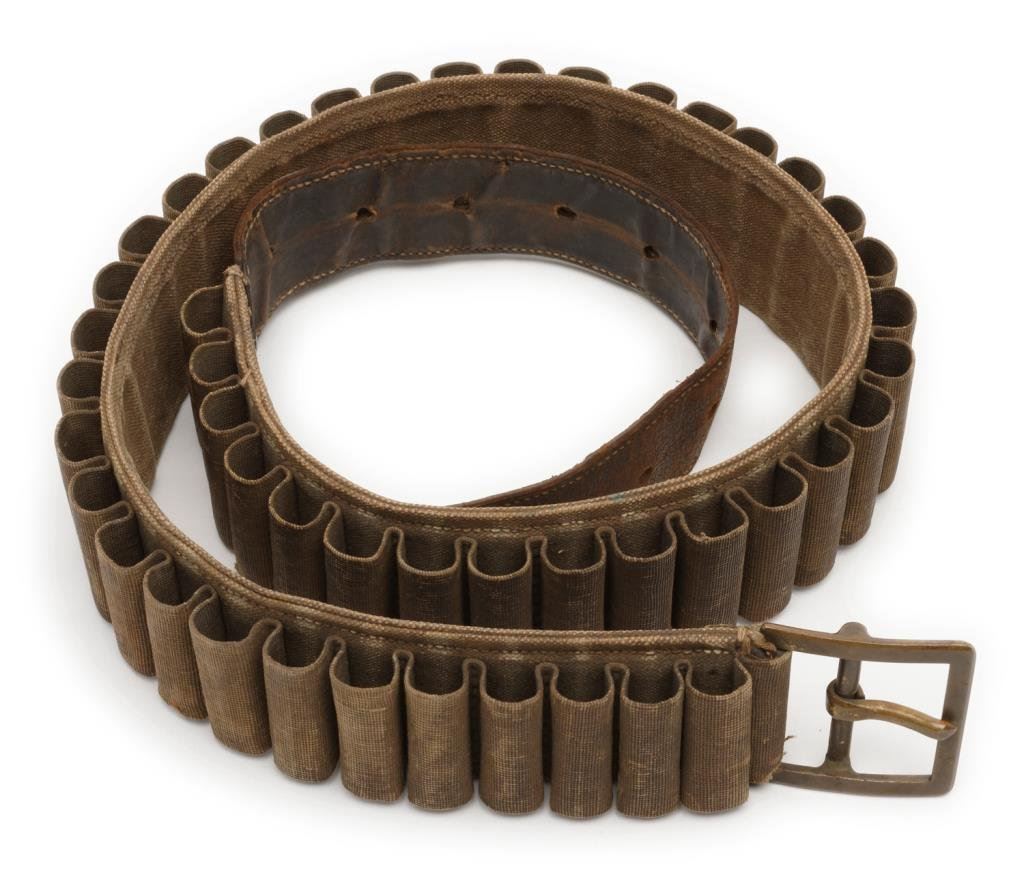 Rare U.S. military “prairie” cartridge belt for .50-70 caliber carbine cartridges in overall very good to near fine condition with leather belt tongue and square brass buckle. Est.: $3,000-$6,000.