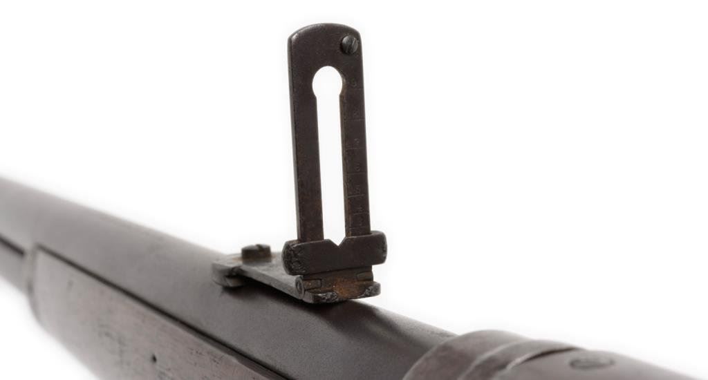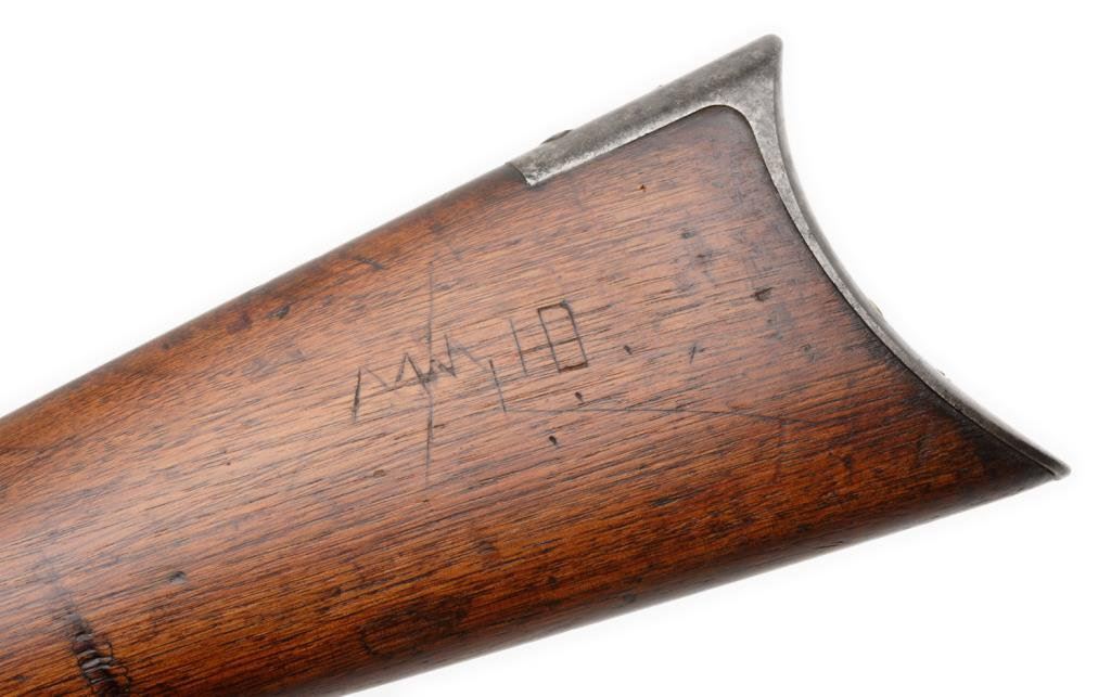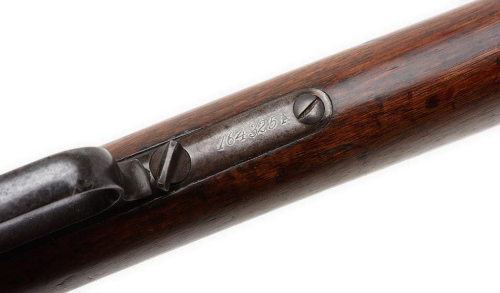 Rare Winchester Model 1873 lever action short rifle, .38 caliber, 22” round barrel, S/N 164325A, blued finish, wood stocks in overall very good to near fine condition displaying the majority of its muted original blue finish on the barrel assembly and considerable original blue finish on the receiver; very good bore, crisp action, good markings and overall good to very good wood with some scattered old nicks and mars from carry and storage plus an old “MM 10” carved into the left side of the butt stock. Est.: $3,000-$6,000.