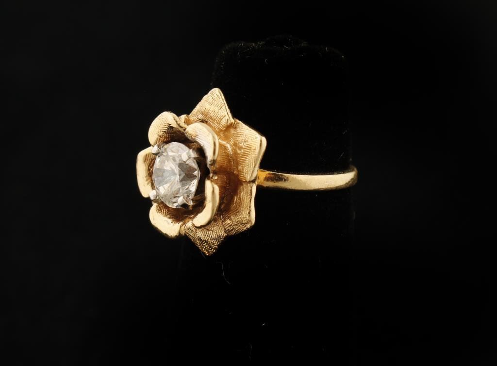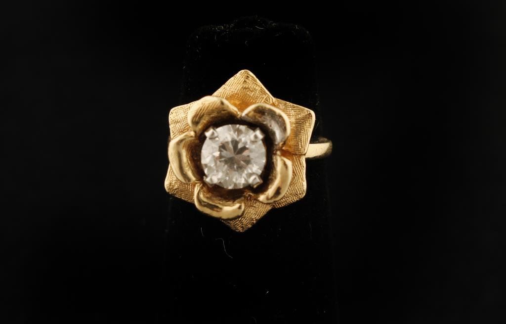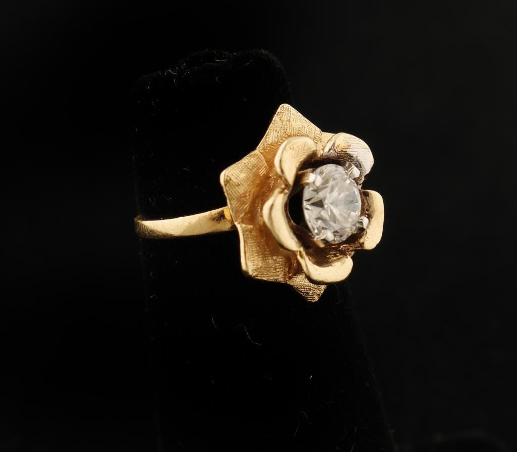 Modern brilliant cut round diamond of approximately .90 in diminutive 14K vintage foral mount. Est. J-K color, SI-1 clarity (verbal appraisal). Est.: $600-$1200