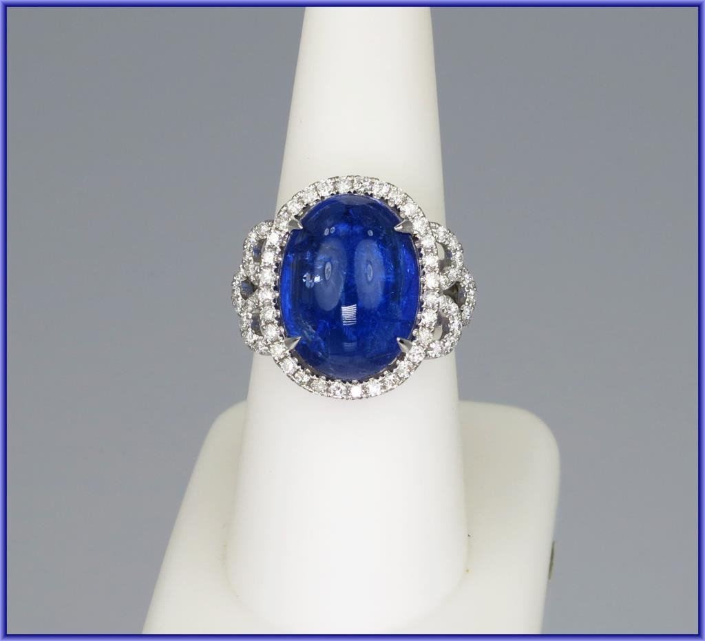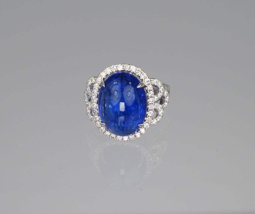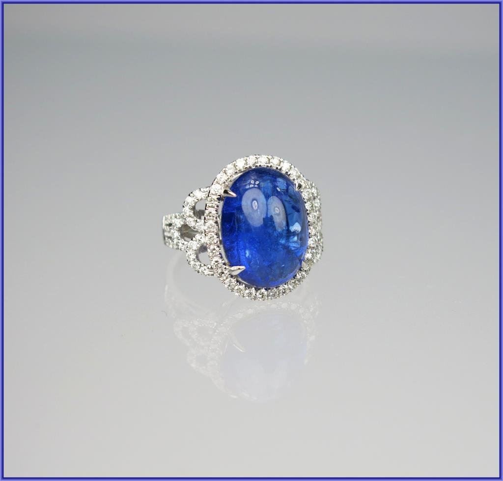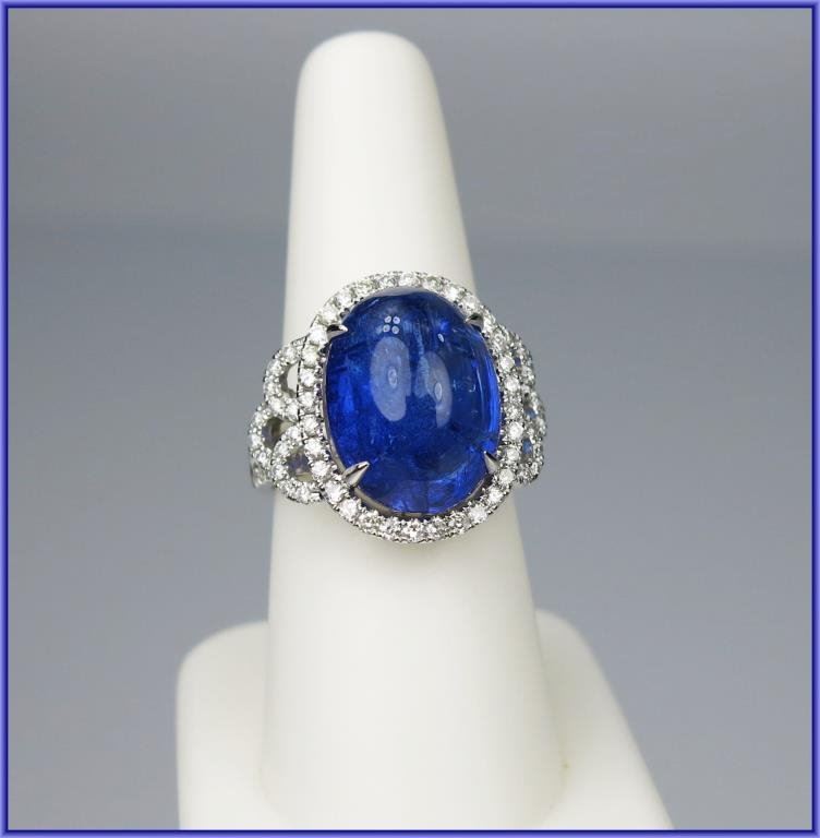 Exceptionally Beautiful Tanzanite and Diamond Ring featuring a 13.50 carat cabochon tanzanite has amazing violet blue color and brilliance accented with 90 round brilliant cut Diamonds weighing 1.12 carats with H-I colors and SI clarity set in elegant setting weighing 8.02 grams of 14 karat white gold. Wonderful NEW Piece. Please See FULL Appraisal. Retail $7,000-$8,000 Estimate $3,600-$4,000