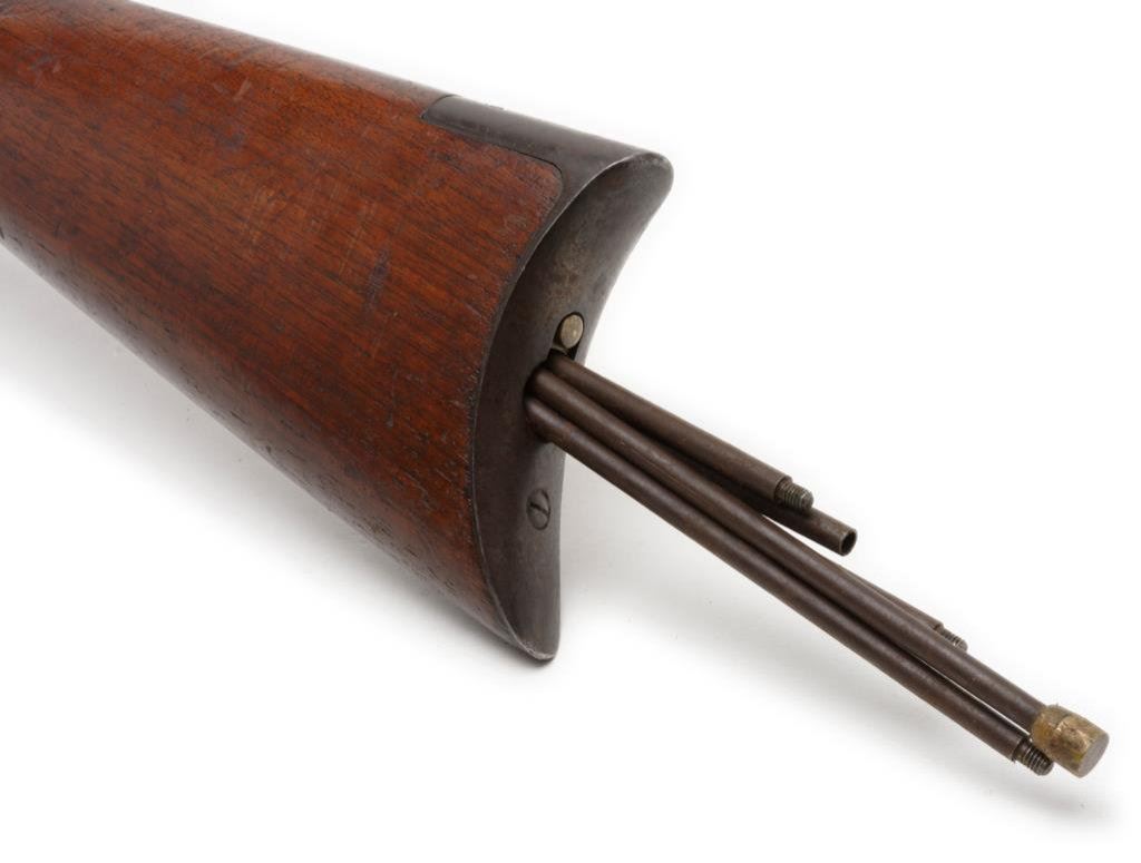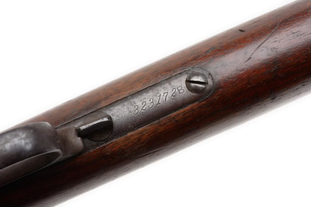 Winchester Model 1873 lever action rifle, .38-40 caliber, 28” octagon barrel, S/N 323172B, blued finish, wood stocks in overall un-cleaned very good ++ condition showing the majority of its original muted finish to metal surfaces with scattered spots of erosion; strong action, sharp markings, very good to fine bore and very good + wood stocks with some scattered old mars to the butt stock; 4 section cleaning rod contained in butt trap. Est.: $2,000-$4,000.