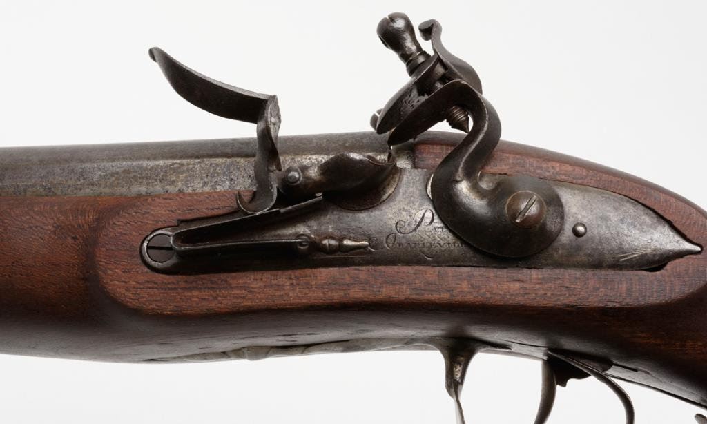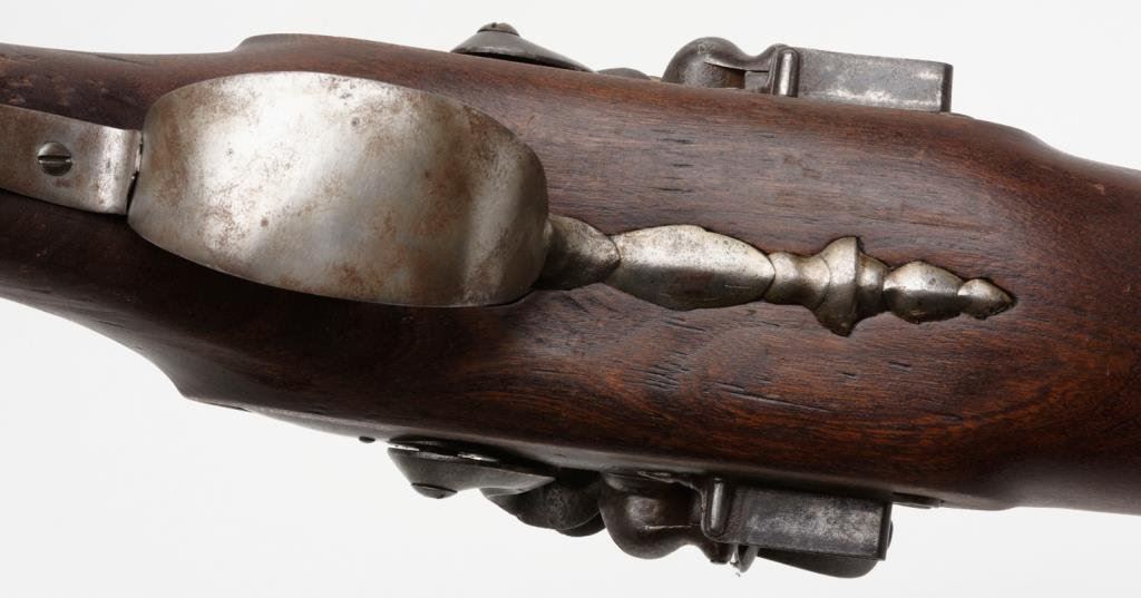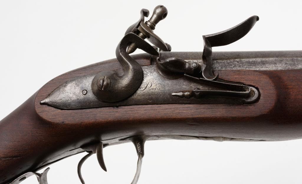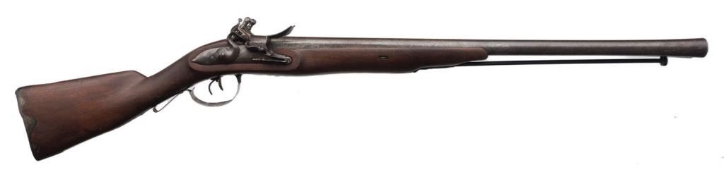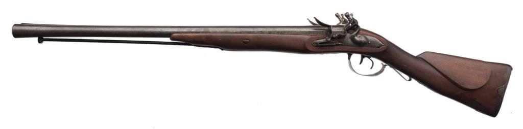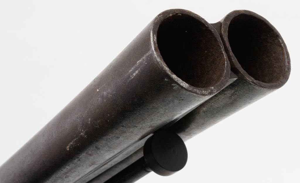 Massive heavy double side by side flintlock large bore rail gun with approximately one and one half inch plus bores; marked on the lock in fine engraved script: “Pat.e Charleville”; measures 48” overall, 3.5” across breech; maker worked ca 1760-1778. Restocked in the 19th Century, probably due to rot aboard a ship. A rare and unusual double flint! Est.: $3,750-$7,500.