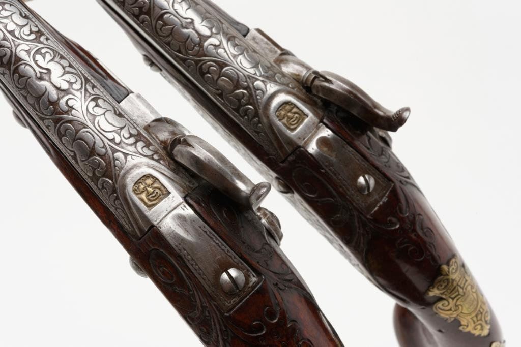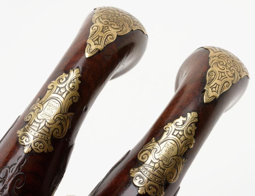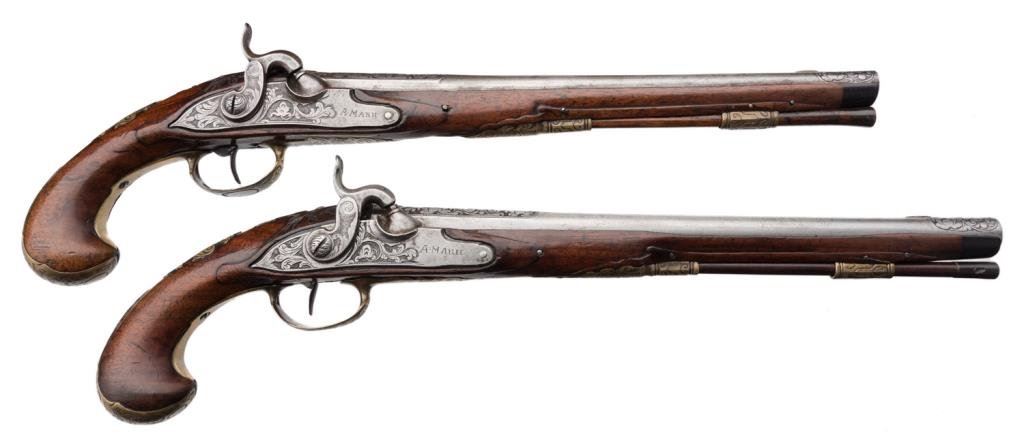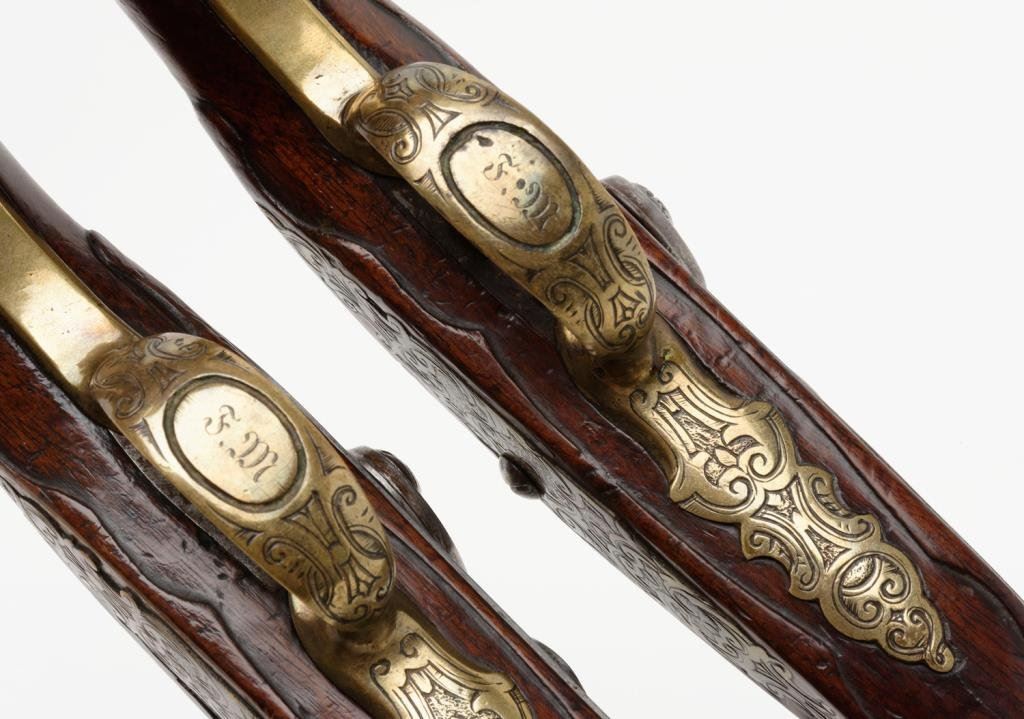 Outstanding pair of 18th Century horseman’s size flintlock pistols converted to percussion and signed “A. Mann” with fancy cast and hand engraved brass mounts with deep engraved and ornamented steel barrels. The pistols measure approximately 20” overall, the barrels measure 13.5” and are approximately .60 caliber smoothbore. The trigger guards show a small panel that is engraved with the initials “F M”; the owner’s plaques mounted in the wrists show a crown with a center panel that is hand engraved with a crown over a shield with three fish intertwined at the center. The butt caps show a small vignette with a single fleur de lis. The balance of the mounts are nicely cast, then hand engraved and chased in scrolls and geometrics; the mounts show good traces of gold gilt. The pistols were originally made ca 1725-1750 and show a good conversion to percussion about 1830 with the hammers engraved to match the lock plates at time of conversion. The barrels show floral engraving on the breech extending approximately 3.75” down the barrel. The