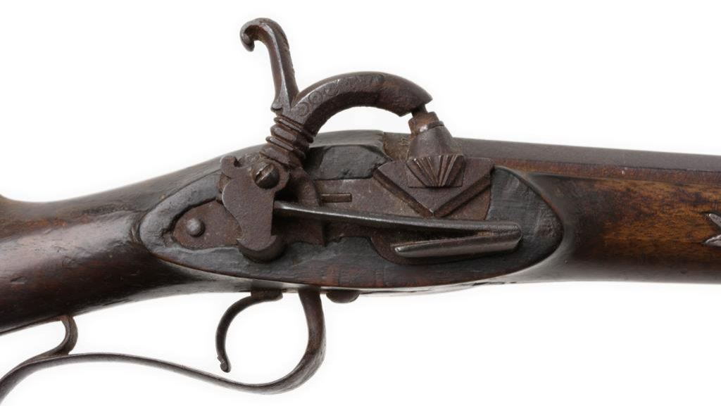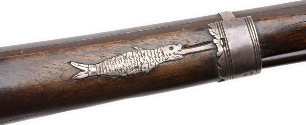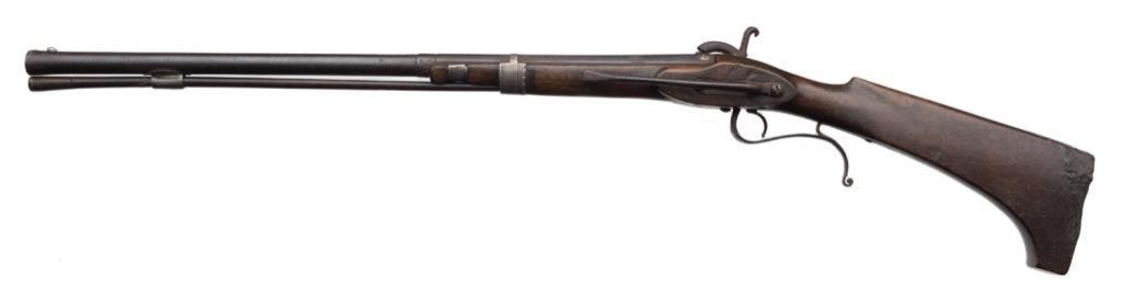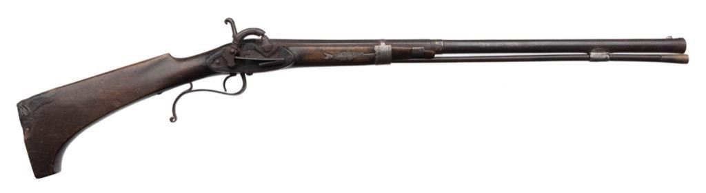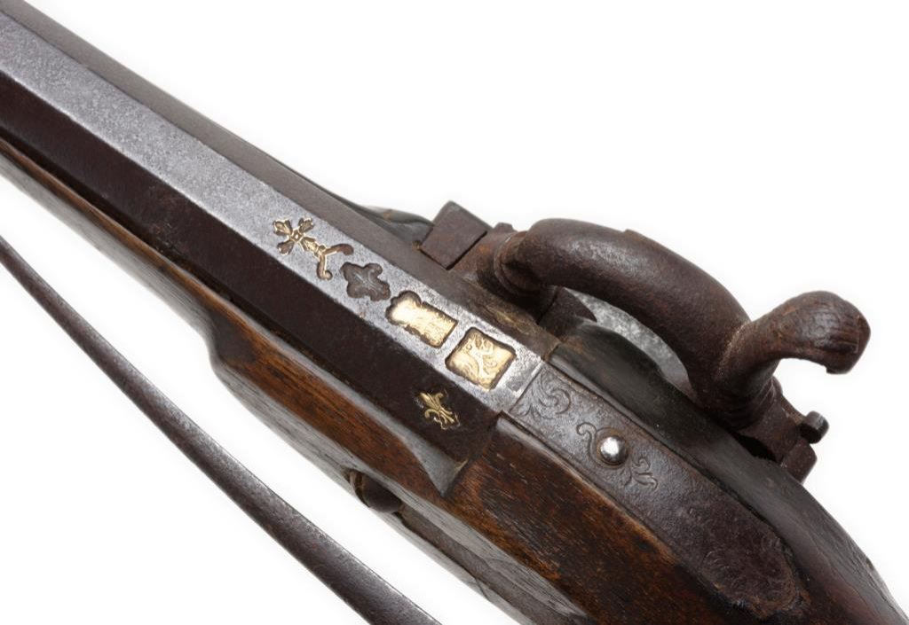 Antique Spanish miguelet carbine, approximately .70 caliber, 25” barrel with gold maker’s marks on top and both sides of barrel at breech, large iron belt hook on left side of half stock with silver barrel band and a pierced silver serpent inlaid into the right side of the fore stock; horn tipped wood ramrod. This great looking early piece is un-cleaned and displays a dark brown patina to metal surfaces; working action and worn stock from years of carry and storage; very old repair to butt stock at rear; easily could have come to the New World as it was previously in an old Texas estate. Est.: $1,500-$3,000.