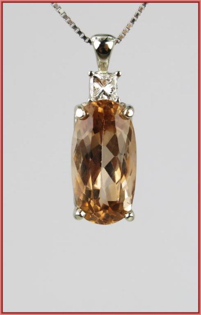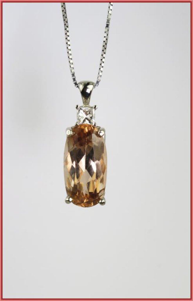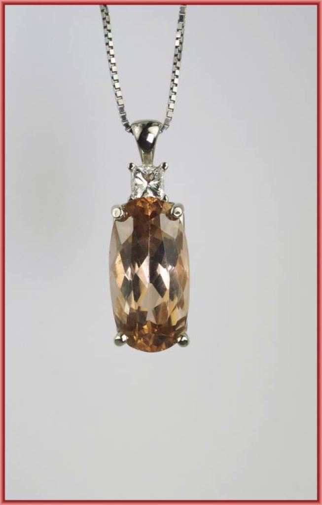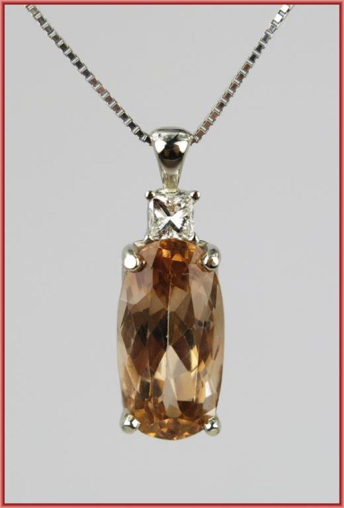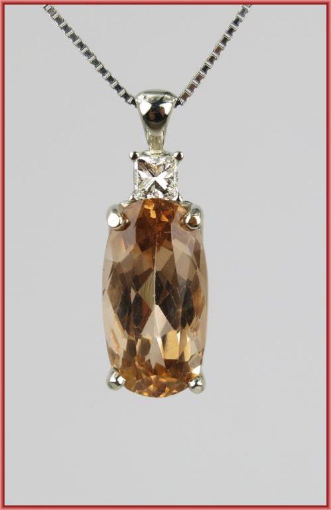 Gorgeous Imperial Topaz and Diamond Pendant featuring an oval cushion cut topaz weighing 13.18 carats amazing peach color with VS clarity accented with princess cut Diamond weighing approx. 0.45 carats with F-G colors set in 14 karat white gold. Imperial Topaz is a Rare and Precious Gem Very sought after by Collectors. NEW Piece. Retail $4,500-$6,000 Estimate $3,000-$4,000