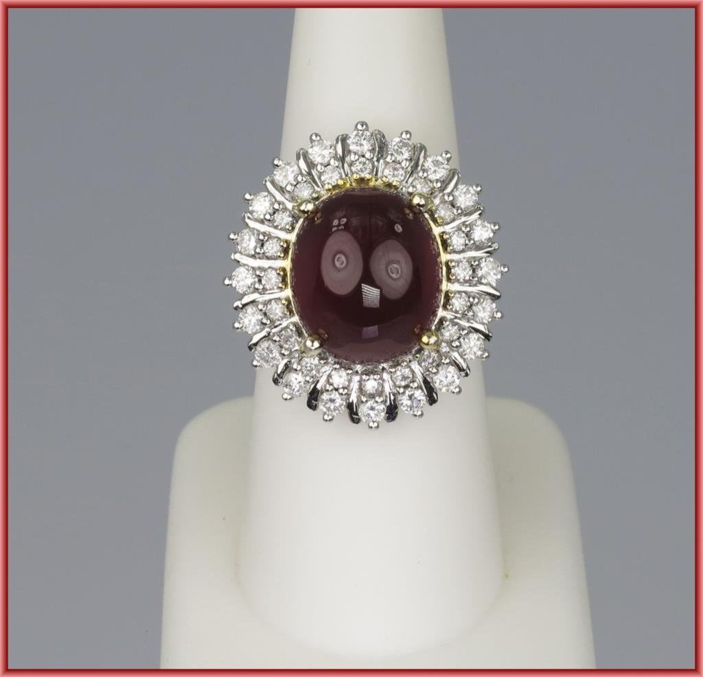Glamorous Cabochon Ruby and Diamond Ring featuring ruby weighing approx. 12.00-14.00 carats (ruby heat/flux treated) set with 40 round brilliant cut Diamonds weighing approx. 1.50 carats with F-G colors and VS/SI clarity set in 14 karat two-tone gold. NEW Piece. Retail $5,000-$6,000 Estimate $3,000-$4,000
