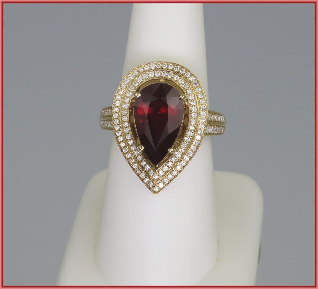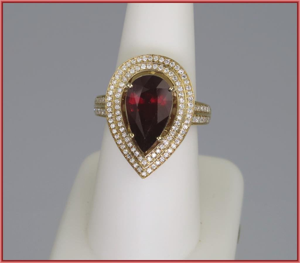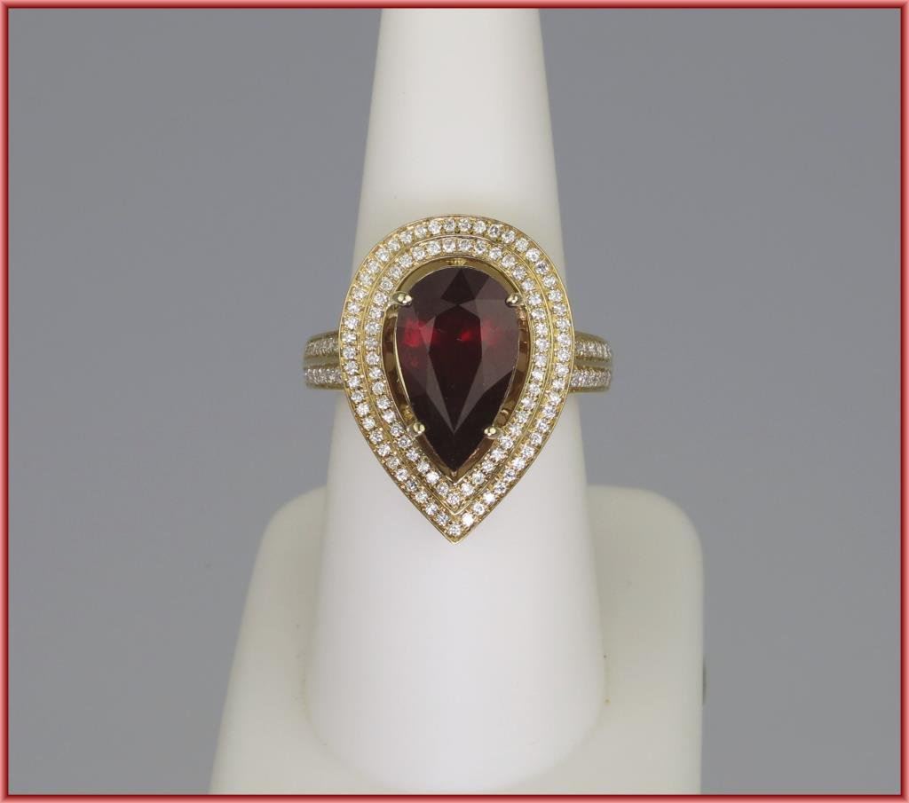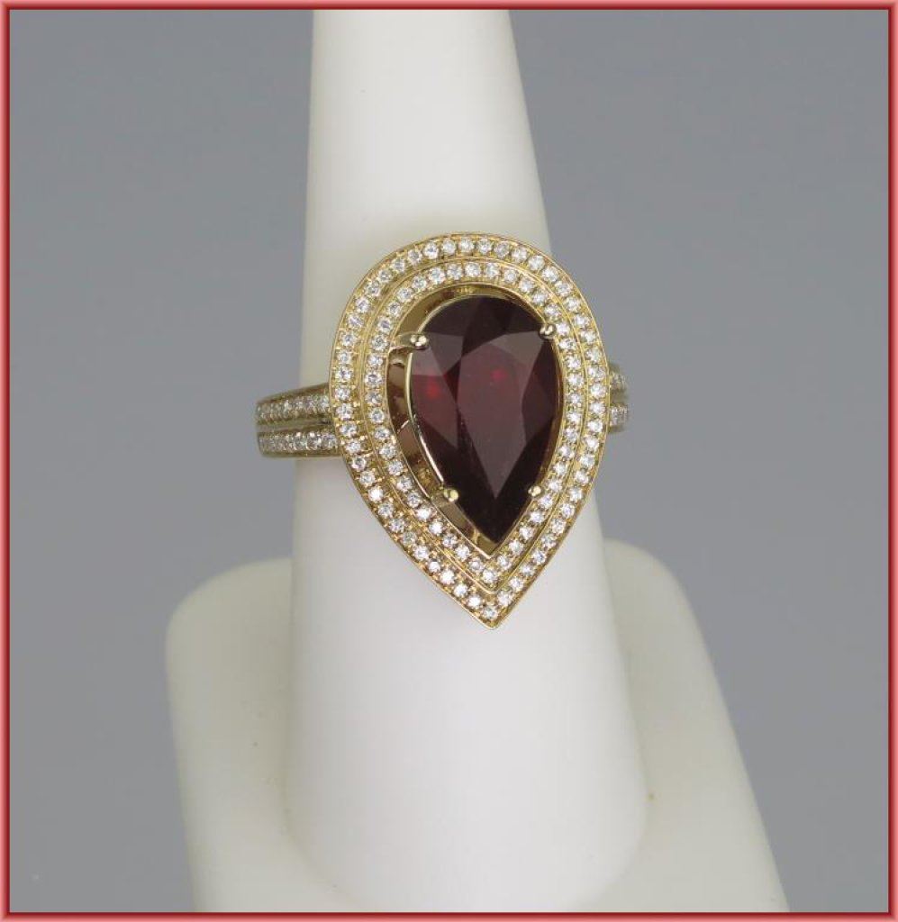 Exceptionally Beautiful Pear Shaped Ruby and Diamond Ring featuring a 5.66 carat ruby with rich, deep red color and very good clarity accented by 122 round cut Diamonds weighing approx. 2.00 carats with G-H colors and SI1 clarity with a finely crafted classic double halo setting weighing 9.2 grams of 14 karat yellow gold. NEW Piece. Retail $5,000-$6,000 Estimate $3,000-$4,000