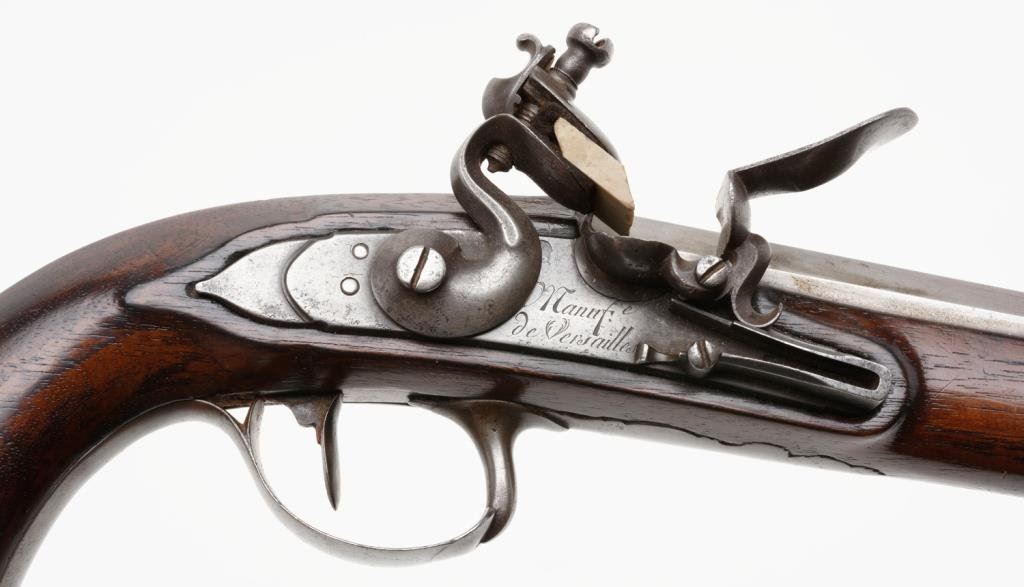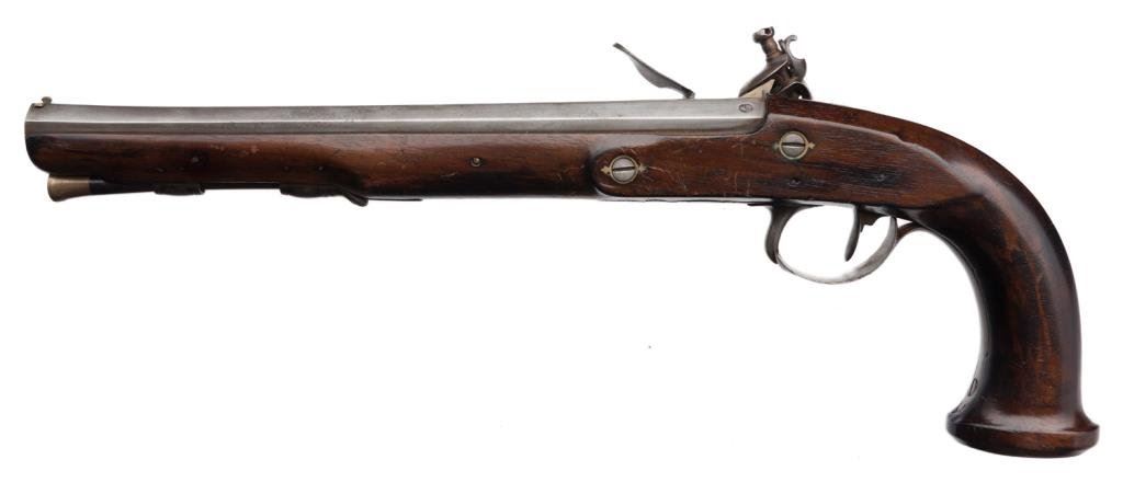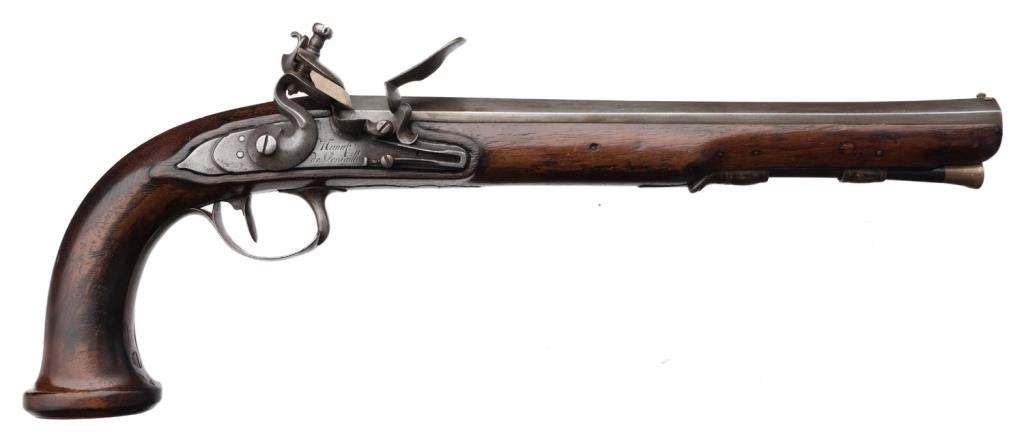 Flintlock pistol of Officer’s style, made during the Napoleonic era when Boutet was Director of the Versailles Arsenal with lock plate marked “Manuf’e de Versialles”; .54 smoothbore caliber, 10.25” octagon barrel with “NB” cartouche on barrel; approximately 16” overall with classic lines and full wood stock and brass tipped wood ramrod; good action, fine markings and very good to near fine wood. Est.: $3,500-$7,000.