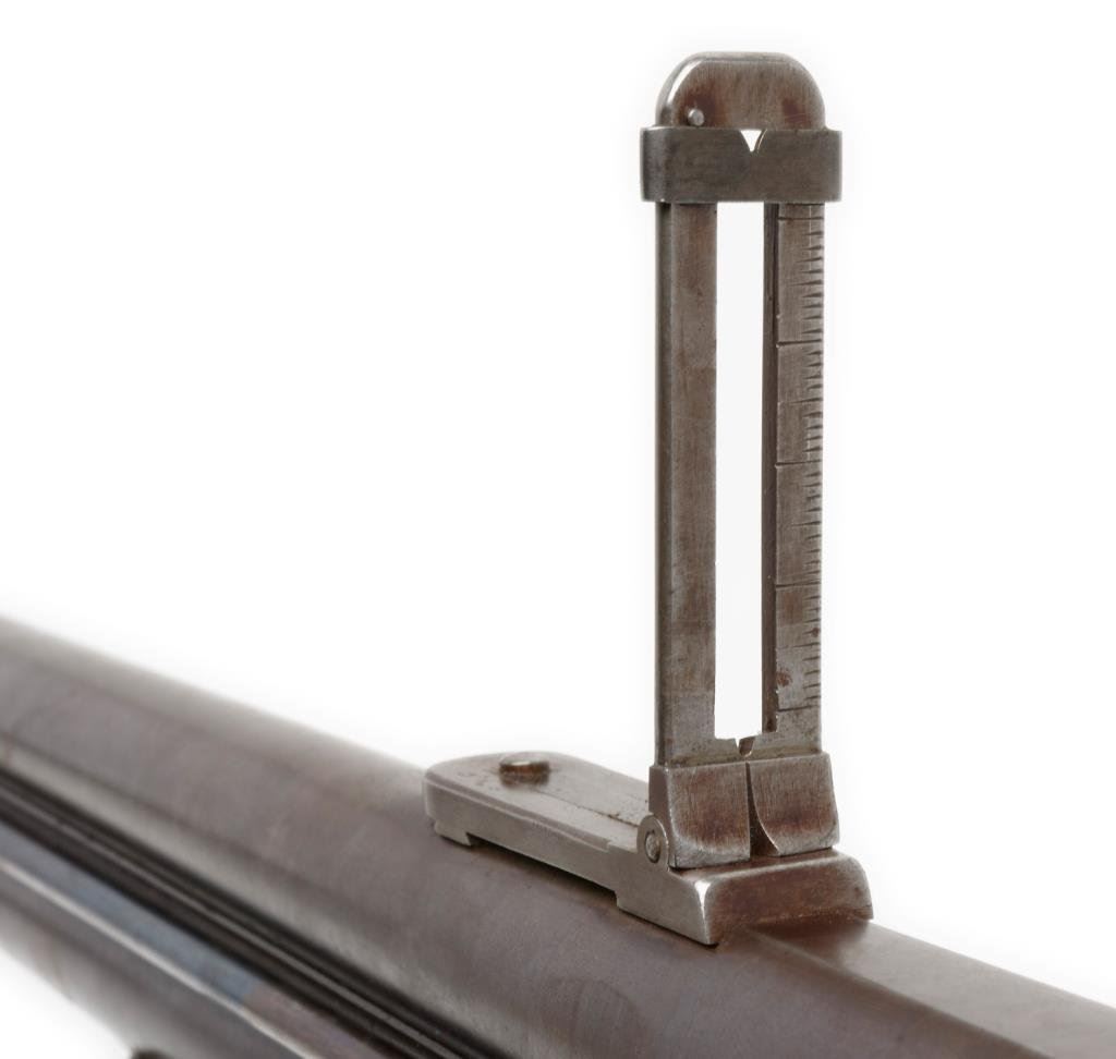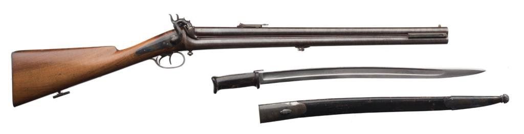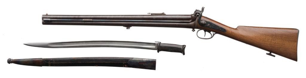 Rare French over/under percussion carbine by Gastinne Renette, a most famous French maker to Royalty that won many exhibitions; approximately .72 caliber rifled over 12 gauge, 24” barrels, tobacco brown colored barrels and case hardened frame, lock plates, hammers, trigger guard and butt plate; wood butt stock, double triggers and accompanied with its side mounted bayonet and scabbard; overall excellent condition. Est.: $4,000-$8,000.