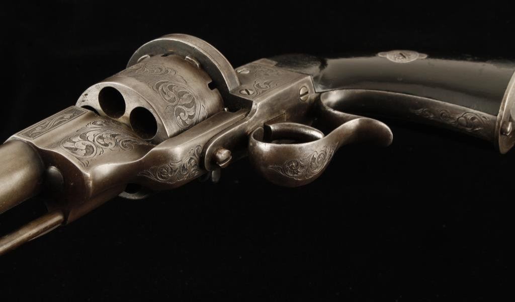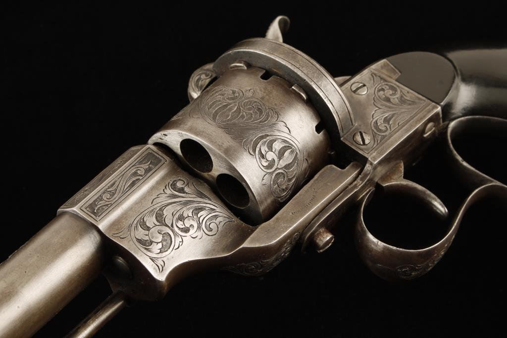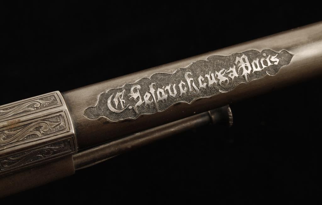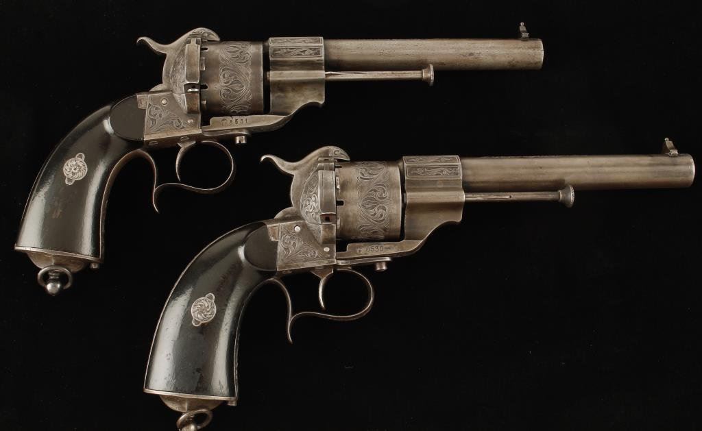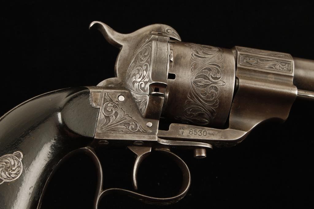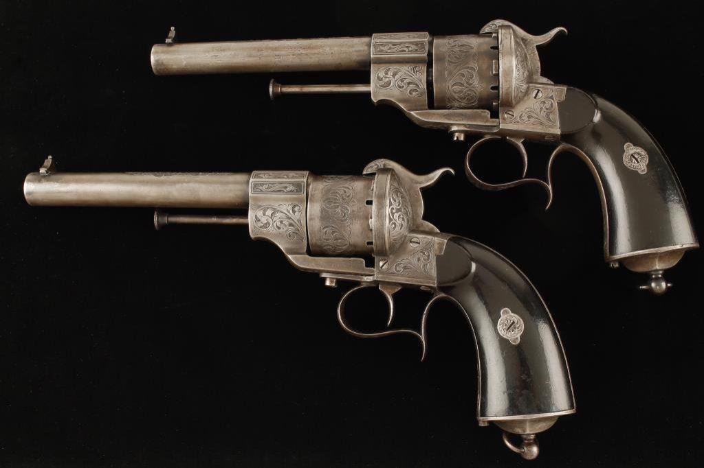 Rare pair of cased engraved and chiseled pinfire large frame revolvers with accessories; 11mm caliber, 6.25” barrels, consecutive S/Ns 8530 and 8531, wood grips, grey patina and wood grips. The guns are in very good to near fine condition with crisp actions, fine engraving including deluxe high relief engraved maker’s barrel banners “C. Lefaucheux a Paris”. Wood casing is in overall very good to near fine condition with green baize lining, accessories and two covered compartments. The right lid retracting arm needs to be re-installed and the left mechanism has a loose screw, both easily remedied. Est.: $6,000-$12,000.