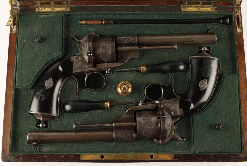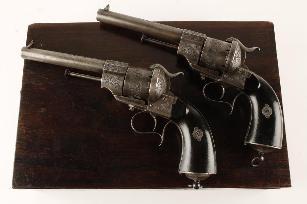 Lot 1070 Rare pair of cased engraved and chiseled pinfire large frame revolvers wit