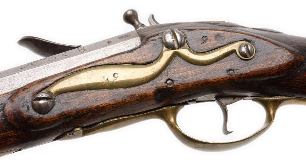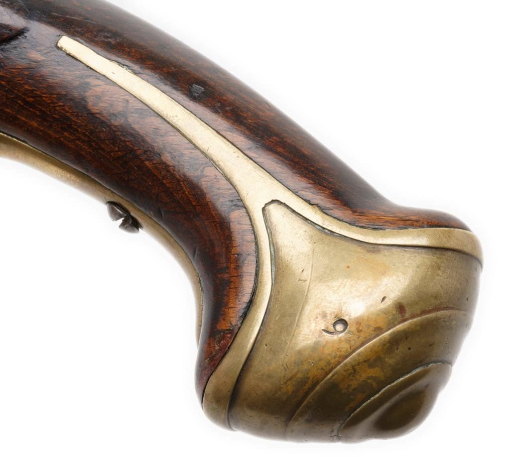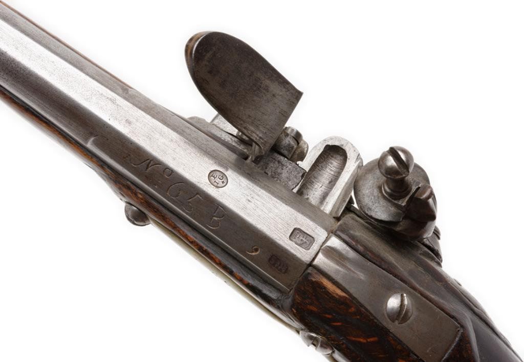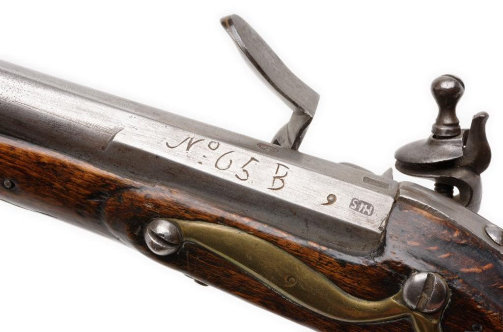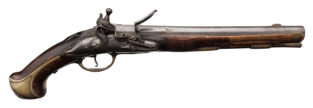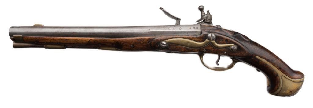Northern European Flintlock pistol, marked "No 65B" on barrel, repair to fore stock, circa 18th century Military issue. Est$1,500-3,000