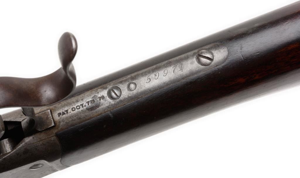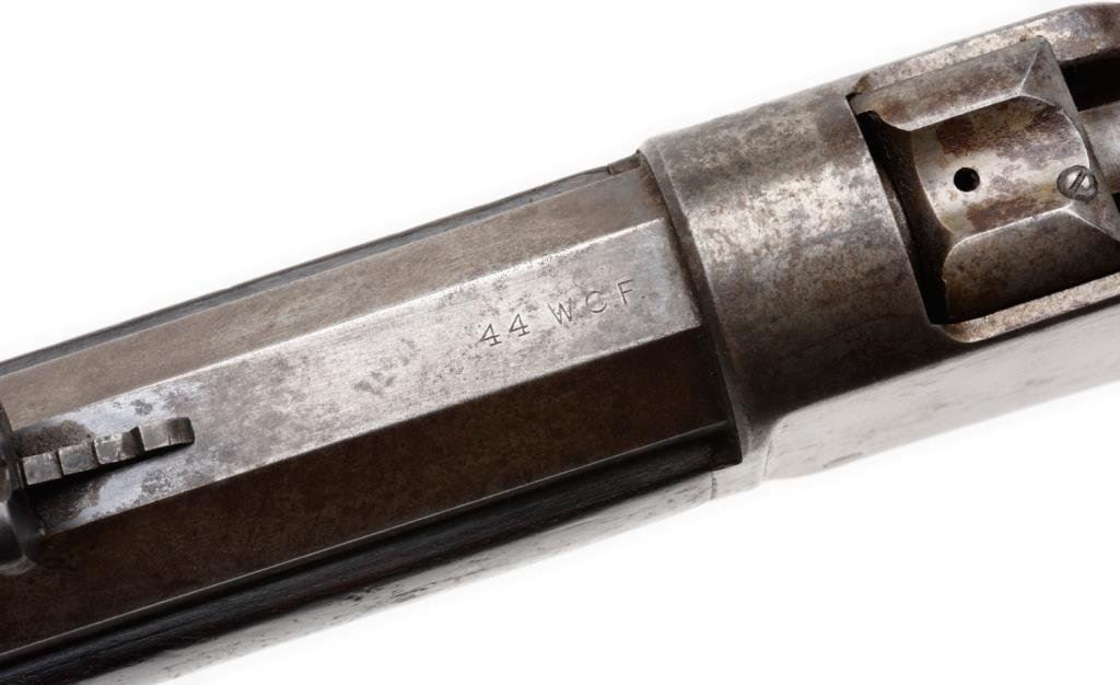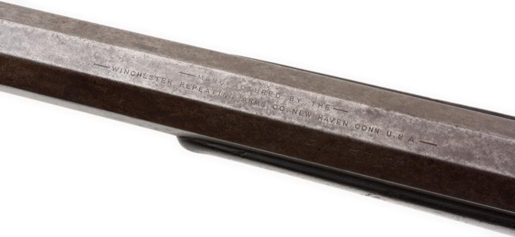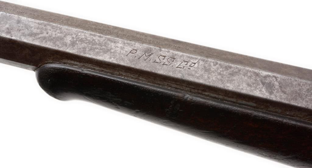 Historic Winchester Model 1885 Hi Wall single shot rifle, in rare caliber .44 W.C.F., 28” octagon barrel, S/N 50971, blued finish, wood stocks and period-marked “P.M.S.S. Co.” (Pacific Mail and Steamship Company) in overall very good condition displaying a brown patina to the barrel and grey patina to the receiver; fine bore, crisp action, sharp markings and very good + wood stocks. Accompanied by an original factory letter confirming caliber, barrel type and length and also noting a #3 barrel weight and plain trigger. This rifle was received in the warehouse on Sept. 24, 1891 and shipped on Sept. 28, 1891 to order number 11476. The Pacific Mail & Steamship Co. was founded in 1848 and was instrumental in the transportation of goods and people to the California Gold Rush area. It also handled the shipment of U.S. Government and private mail. Its many ships traveled to Central and South America, to the Northwest of the U.S., to Alaska during the Klondike gold rush and also to China and the Orient carrying passengers, mail and goods. The Company was