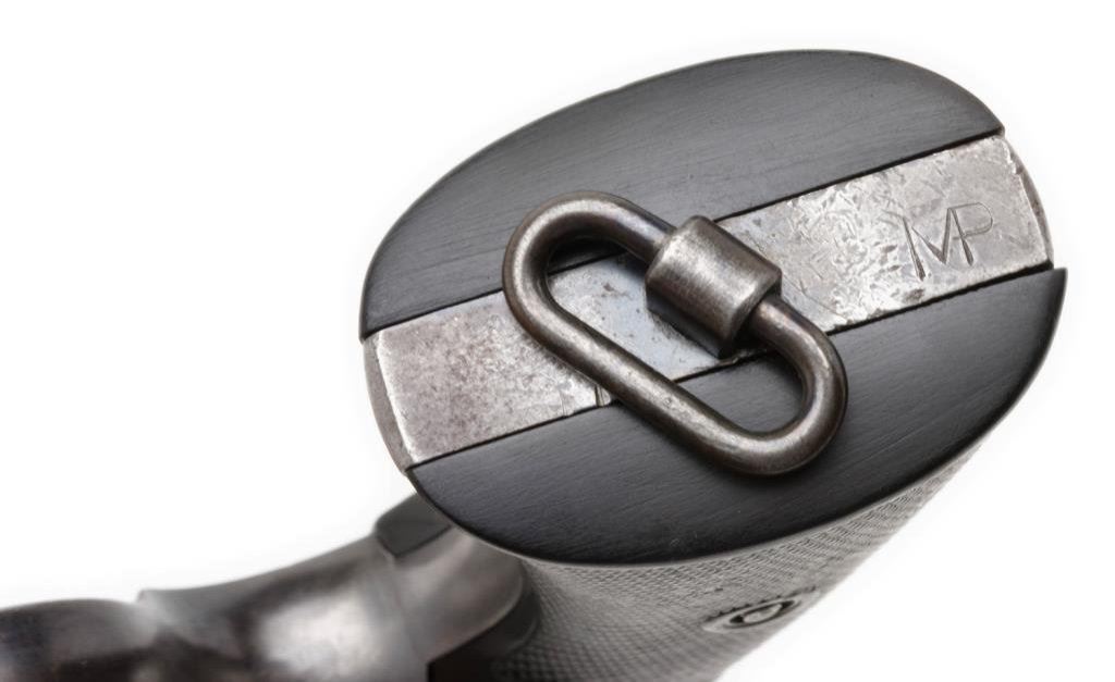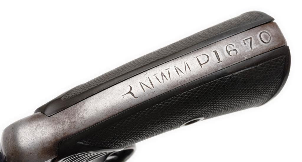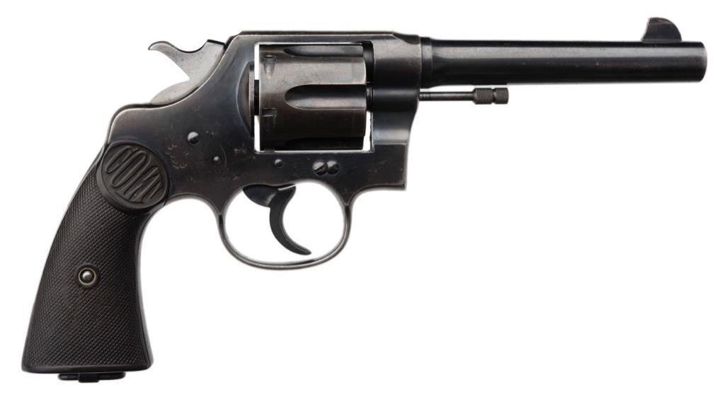 Desirable Colt New Service DA revolver, .45 Colt caliber, 5.5” round barrel, S/N 146837, blued finish, checkered black hard rubber grips, back strap stamped “RNWMP 1670” and butt strap is stamped “MP”; lanyard ring present. This Royal Northwest Mounted Police service weapon is in overall very good to fine condition displaying the majority of its original blue finish with thinning of the finish on the back strap from handling; the action and markings are crisp, the bore is very good +. Accompanied by an original factory letter confirming caliber, barrel length and finish (Type of stocks “Not Listed”). Shipped to the Commissioner, Royal Northwest Mounted Police, Canada on October 8, 1919 in a shipment of 200 same type guns. Est.: $1,750-$2,750.