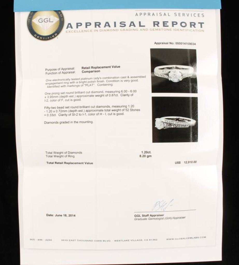 .87 pt. Center Diamond mounted in Platinum with 1.20 accenting Diamonds, appraised F-Color I-2 Clarity by G.G.L. (Westlake, Ca) Retail Replacement value $12,910 Est: $2,500-5,000