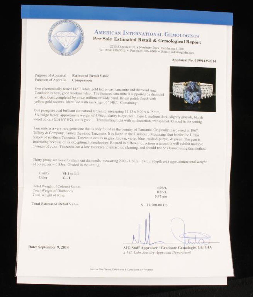 Tanzanite approx. 5 carat (est. 4.96) in 14K with surrounding Diamonds. A.I.G. Appraisal at Retail Replacement $12,780. Est: $2,500-5,000