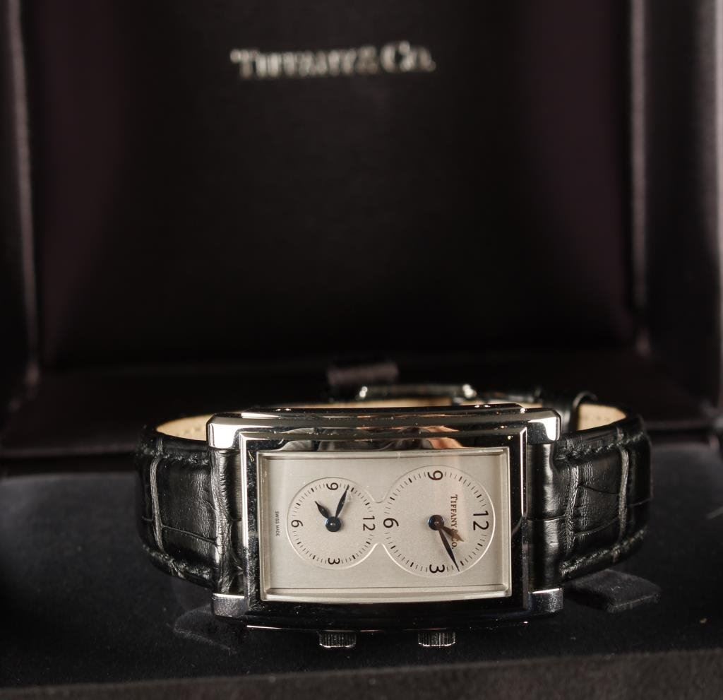 Tiffany grand quartz resonator dual time zone wrist watch, signed dial and champagne mist face. Original marked Tiffany strap. In excellent condition and needs battery. In Tiffany marked original box. Swiss made and out of production approximately 10 years. Not a knock off. An original Tiffany!! Est.: $2000-$4000