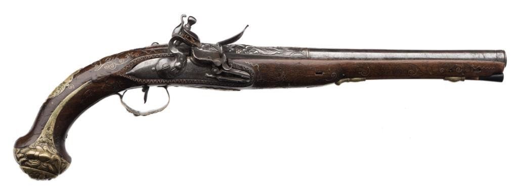 Magnificent flintlock pistol signed “Vergnes A’ Marseille” with gold gilded over sterling hallmarked mounts. The pistol measures 19 ½” overall with 12 ½” BBL of 60 plus caliber. The barrel is chiseled in high relief. The stocks show about half it’s silver wire inlay. The condition is very good overall. Shows crescent moon indicating sales to mid-east. Est.: $2500-$5000
