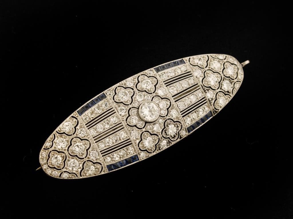 Antique white gold or platinum broach/pendent mounted with diamonds and accented with blue sapphires circa 1900-1920. European cut fine white diamonds well matched and 1/3 CT center. Estimated weight of diamonds 4 to 6 CT. total. An estate piece. See appraisal. Est.: $2500-$5000