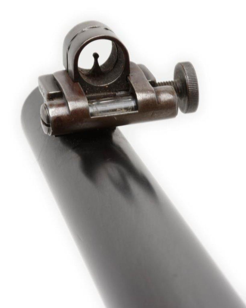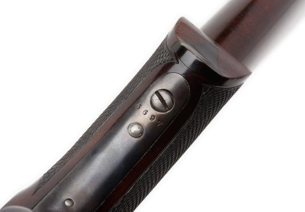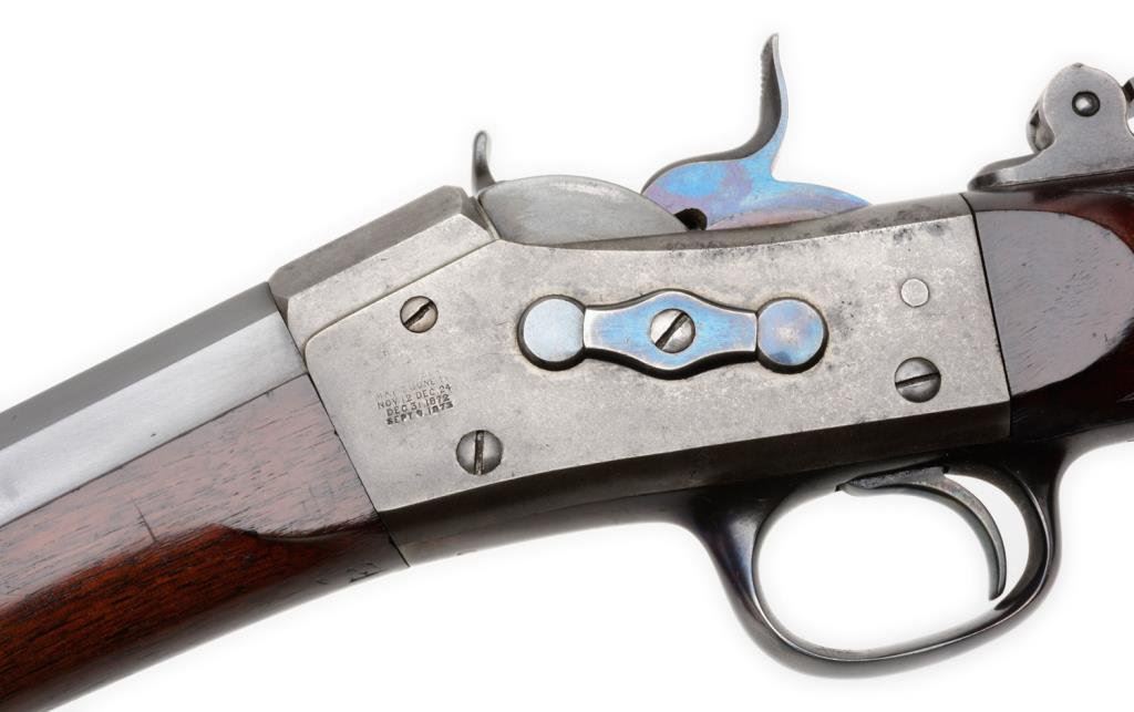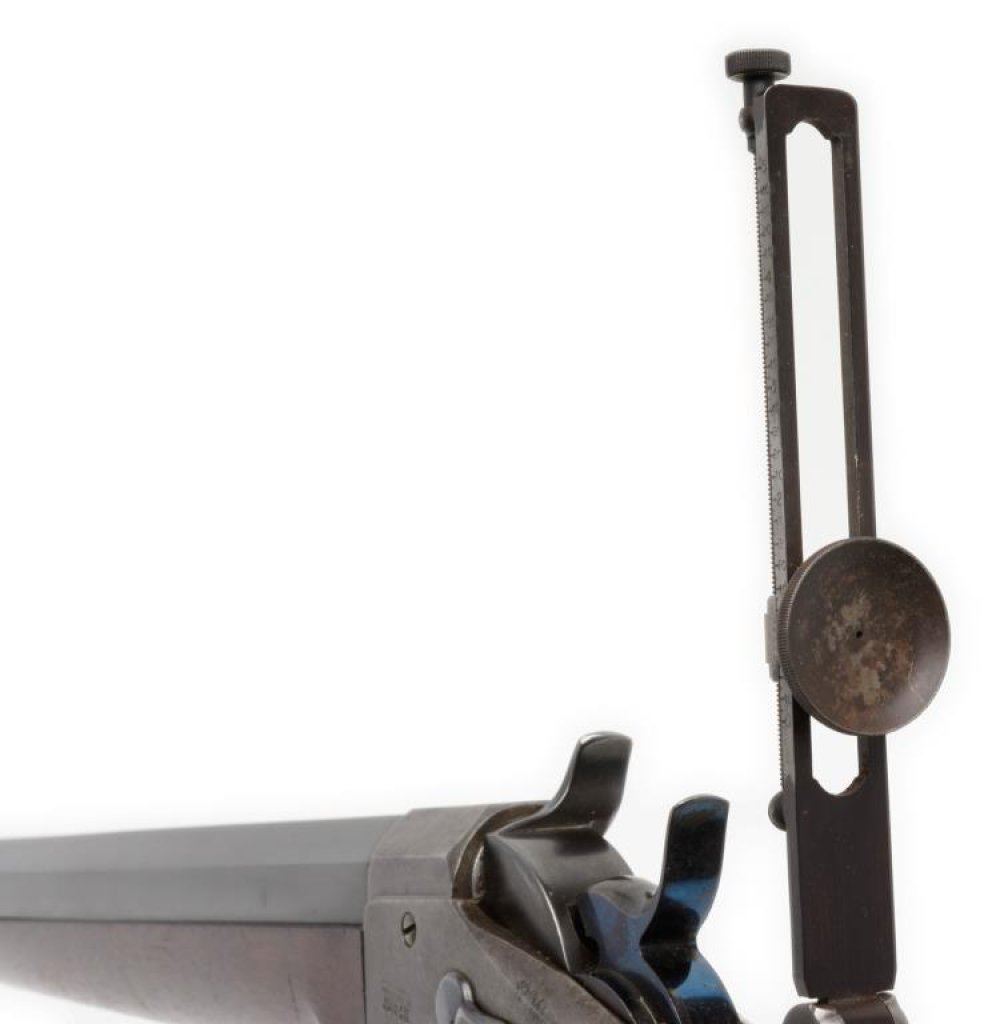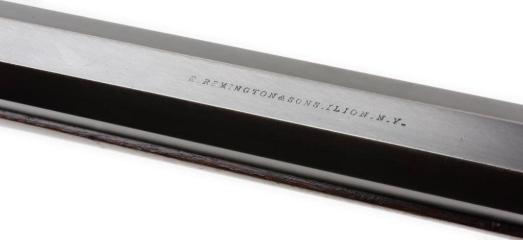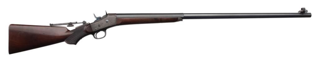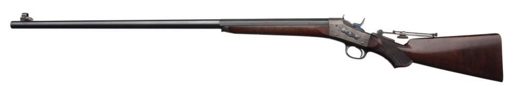 Remington Rolling Block long range Creedmore style rifle in .44-77 Sharps strait caliber. This rifle shows 34” half round-half octagon BBL, checkered pistol grip stock, Venier long range rear sight, adjustable spirit level front sight. The top of butt by the butt plate shows holes to mount rear sight for prone position. The rifle remains in very good plus condition with 85%-95% blue on crisp barrel, 10%-20% case hardening drifting to silvery gray on the frame, very good plus wood stock with just minor aging. The hammer and block show most original blue. The bore is bright and near fine condition. S/N 6697. Est.: $3500-$7000