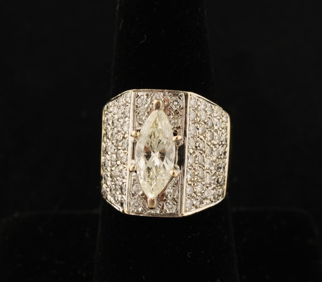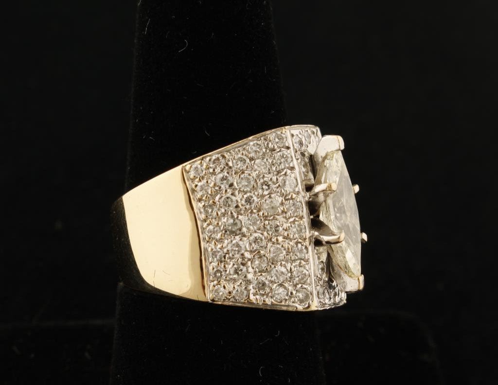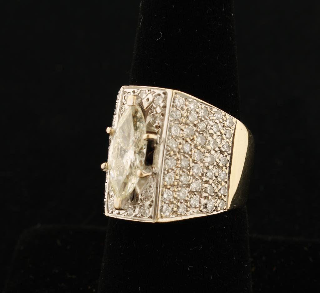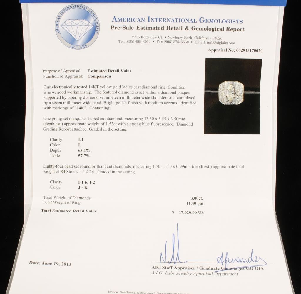 Over 1 1/2 carat (approx. 1/53 estimated carat) Marquis cut Diamond in 14K yellow gold mount with .84 surrounding diamonds estimated at 1.47 for nearly 3 carat total. Appraised at $17,620 Retail Replacement value by American Int'l. Gemologists, Newbury Park. Center Diamond L-Color, I-1 Clarity Est: $3,500-7,000