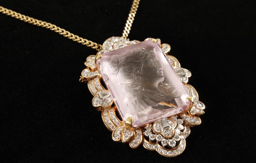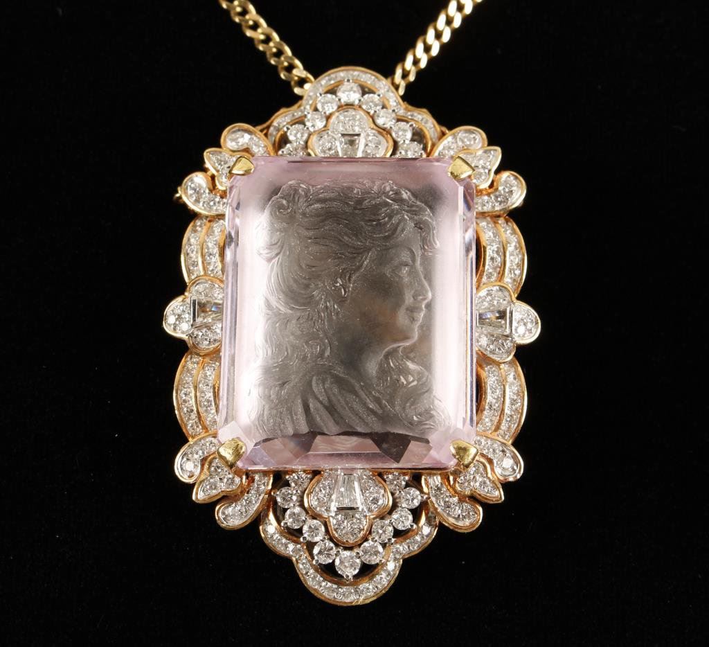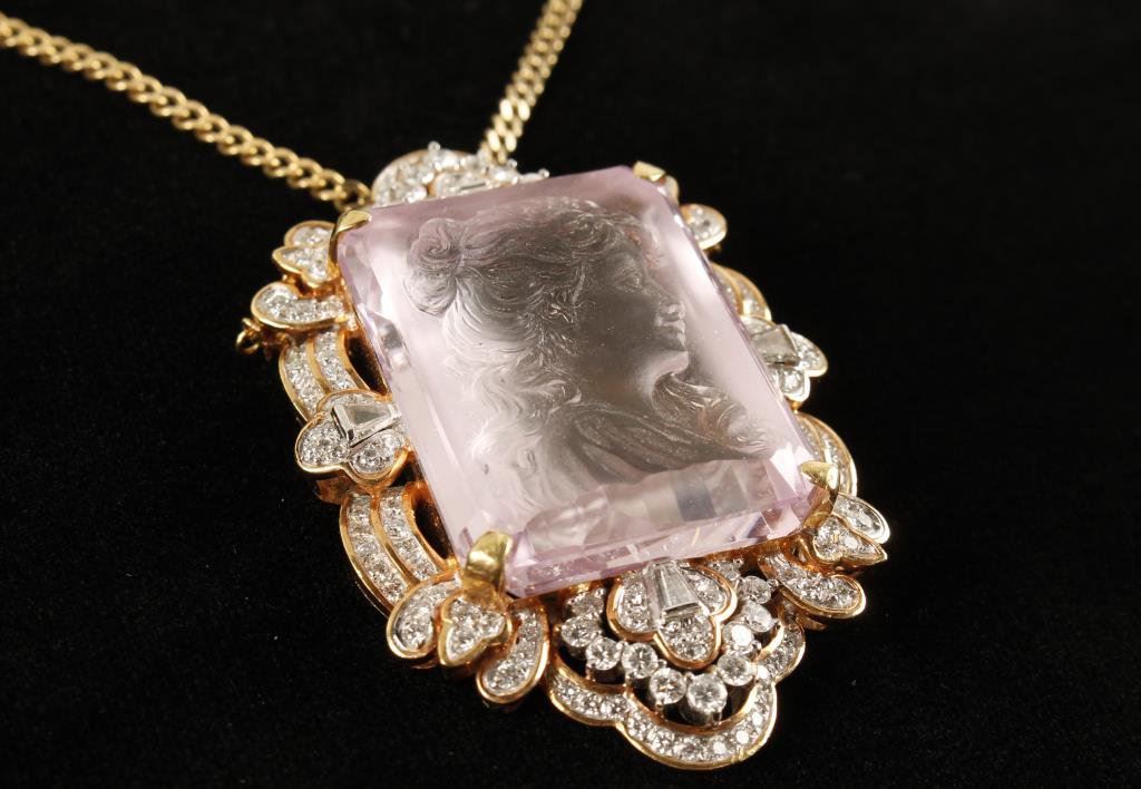 18K gold pendent with kunzite gem stone carved in cameo accenting with 5 CT diamonds. 14K gold with 25” chain. Magnificent and highline. Probably Italian. Est.: $5,000-$10,000