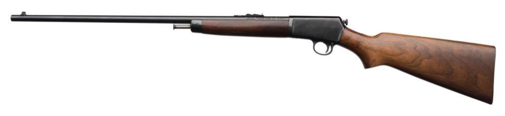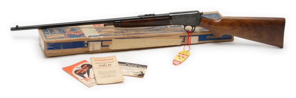 Winchester Model 63 semi-auto .22 Cal. rifle marked for super x and super speed with 23" barrel, S/N 108059. Excellent to mint condition in original serial numbered box with instructions, hanging tag and packing material. 99%-99.9% plus with the most limited of handling and storage only. A true factory original gun that is not quite brand new but close. It would be unrealistic to try to collect old guns in better condition. Est.: $1500-$3000