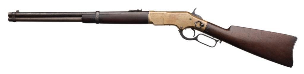 Winchester Model 1866 SRC in .44 rimfire, S/N 161088. This carbine remains in very good original condition showing sharp BBL address with strong traces of blue mixed in with a brown patina on the BBL and tube. Some minor erosion and pitting started but just normal age. The frame is sharp and crisp with factory lacquer turned gold color often mistaken by amateurs as gold plating. Traces of finish on loading gate, bolt and small parts. The wood is very good plus with minor scratches, dents and imperfections. The action is good and the bore is worn but above average overall. Tight edges to side plates and a very pleasing frame. Made 1883. Est.: $6,000-$12,000