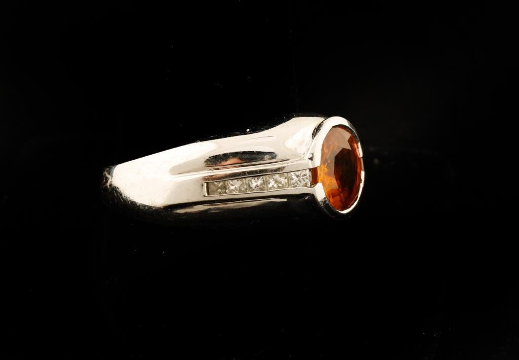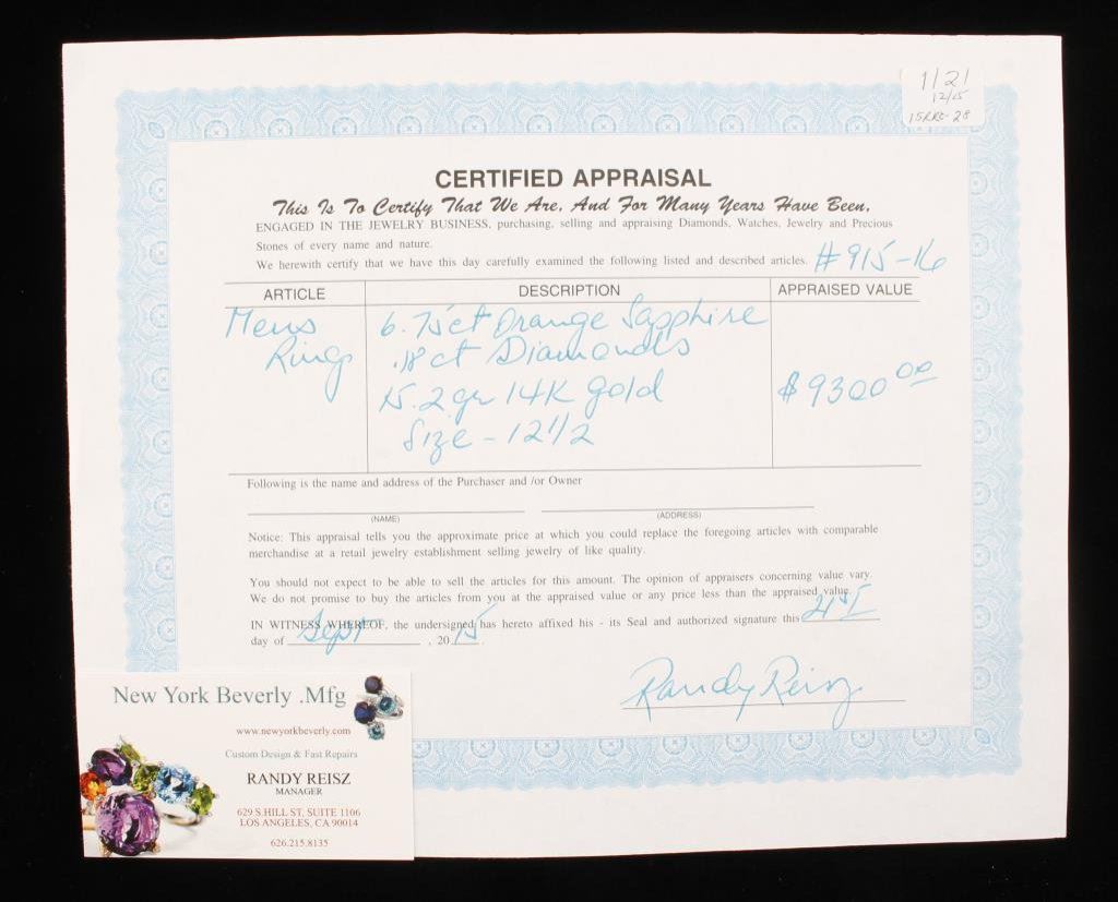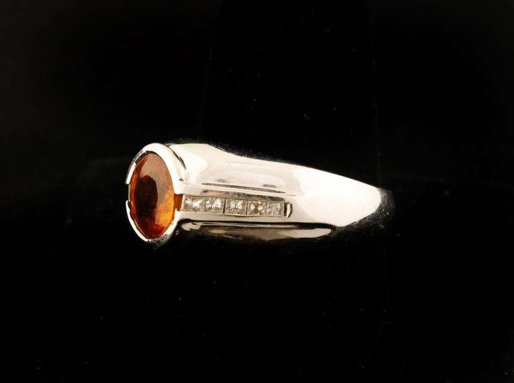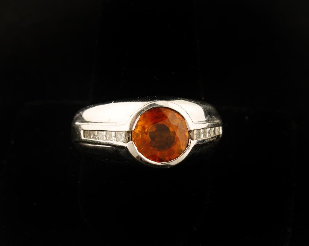 Collector's type 6.75 carat Orange Sapphire with accenting Diamonds set in 15.2 gr 14k gold, size 12 1/2, Retail replacement $10,000-12,000. Est:$4,000-8,000