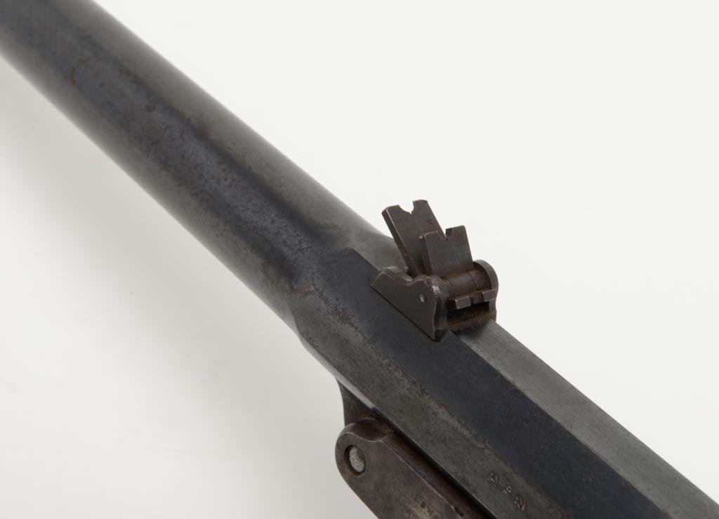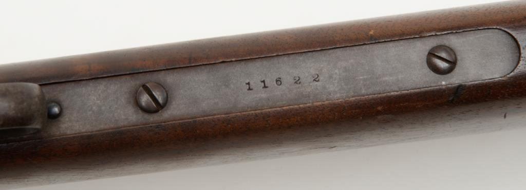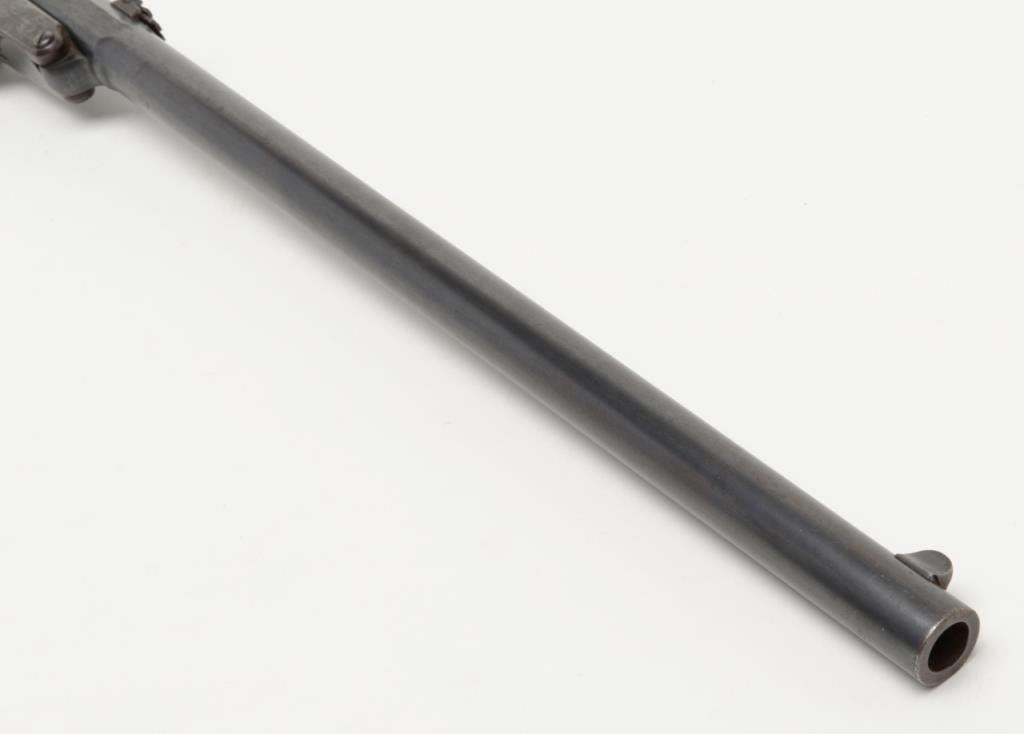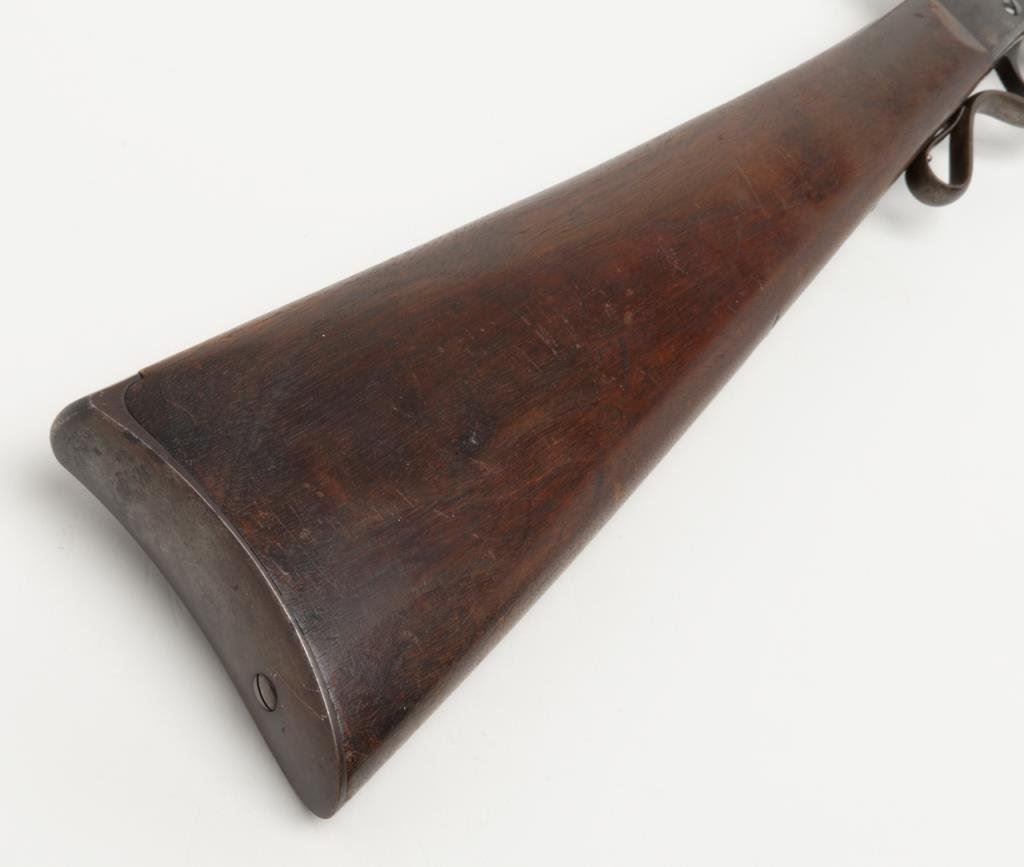 Maynard Civil War carbine in .52 caliber percussion remaining in very good plus to near fine original condition, serial number 11622. The barrel retains 60% to 80% original blue drifting at the edges and some toning to a patina. There is approximately 3” area of pitting and erosion about 8” back from the muzzle. The frame shows 30% to 50% case hardening with some good colors drifting to a even patina. The stock is very good plus with a couple of minor losses and storage marks with two good sharp cartouches. The markings on the frame are sharp and crisp. The bore is bright and near excellent. All original small parts and sights are retained Est.: $1,600-$3,200