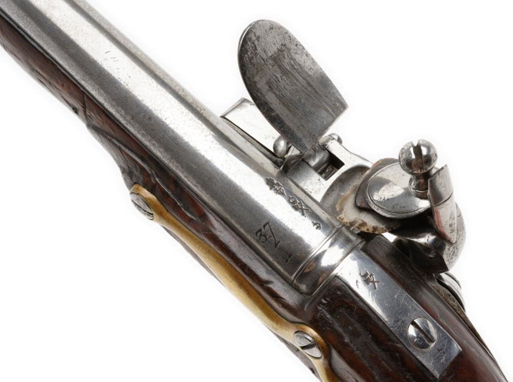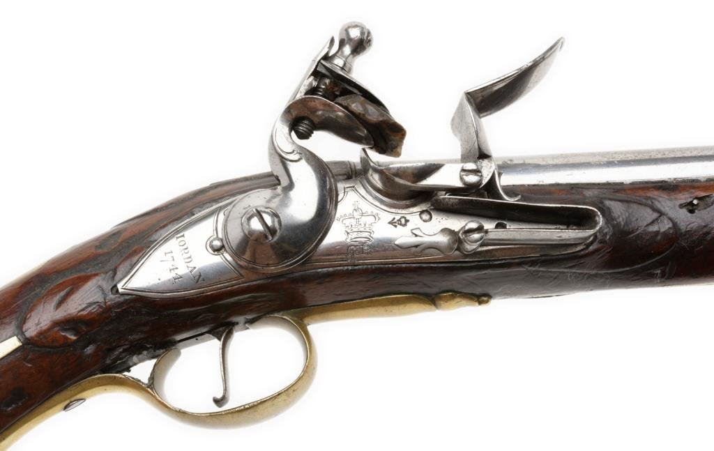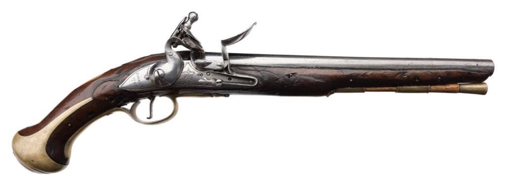 Lot 1143 English flintlock martial pistol signed “Jordan” and dated 1744. Measures