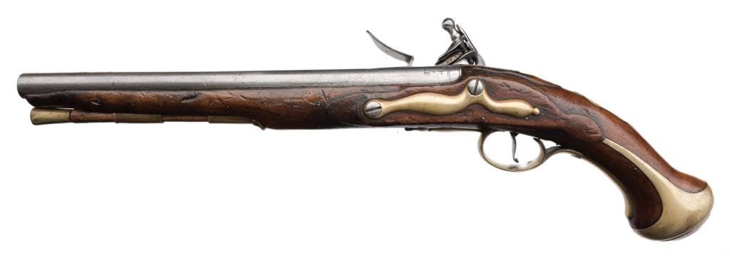 English flintlock martial pistol signed “Jordan” and dated 1744. Measures 19 ½” overall in approximately .60 cal. with a 12” BBL showing brass mounts. Shows full compliment of inspections and proofs with rack #37 and 2 on the left rear of the barrel near the breach. The metal shows light cleaning but sharp markings and crisp edges. The stock is very good plus and would have been fine except for the storage or rack marks underneath the lock behind the trigger. The best condition early flintlock martial of this type we have viewed in a decade. Pre-revolutionary. Est.: $5,000-10,000