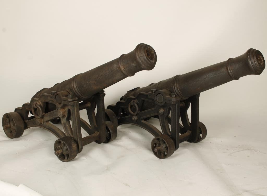 Impressive pair of British iron cannons, ca early 19th Century, each barrel approximately 38” long and each mounted on an iron carriage with iron wheels; each carriage approximately 22” wide and 17” long. Est.: $7,000-$10,000.