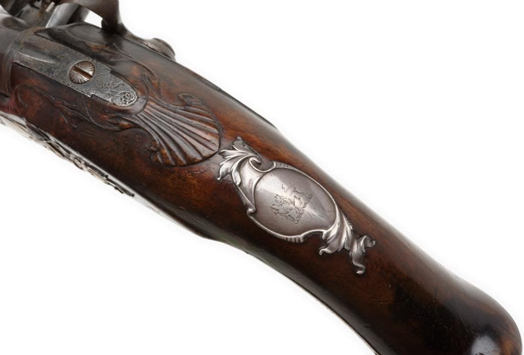 Silver mounted Horseman’s size flintlock pistol by Thorpe circa about 1760-1780. Measures 17 ½” overall with a 11” BBL. Shows beautifully engraved crest in the wrist plaque of English lion with spear. Very elegant form and quality throughout. About .56 cal. In original flintlock and very good plus condition. Est.: $3,000-$6,000