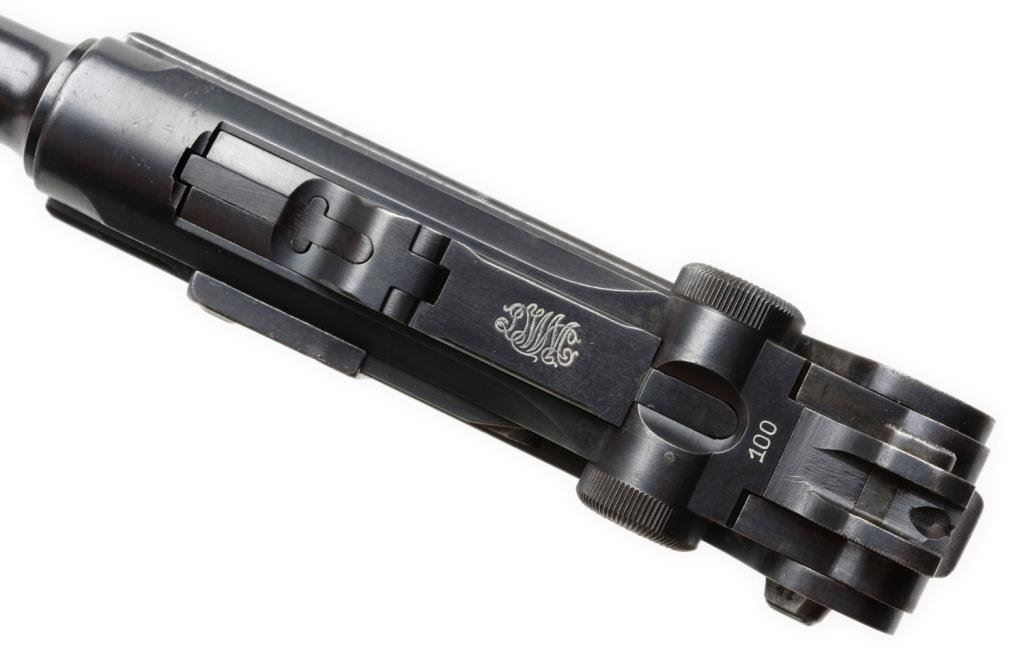 1908 Navy Luger by D.W.M. serial number 1841 with documenting letter to use in “Eastern Upring” by Irish patriots. The Luger shows “I I T D 2239” on the back-strap indicating Kiel Navy Yard Torpedo School second division. A 1996 dated letter signed by William Edwards of the Gold Rush Gunshop traces this Luger from 1948 in Dublin through his buying 28 Lugers from the Irish Department of Defense. Notarized document and copies of invoices included. The luger remains in original very good condition with 80%-90% original blue, good markings, some wear to good grips, and matching except later clip from WWI era. A great and historic Irish rebellion arm. Est.: $7,000-$14,000