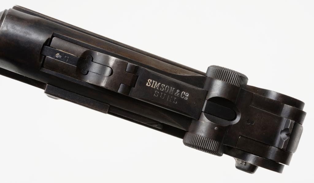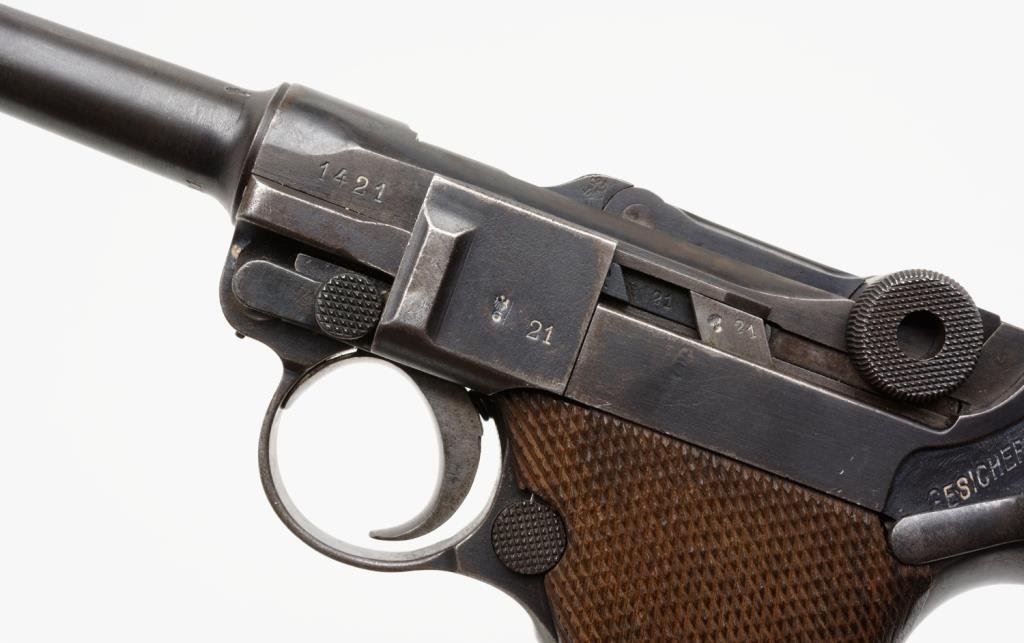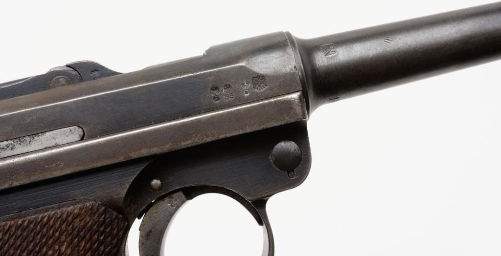 **Radom Model P-35 semi-automatic pistol, nazi proofed, cut for stock, 9mm caliber, 4.5” barrel, S/N E3943, 96-98% early blued finish, fine bore, crisp action, fine grips; a desirable and near flawless Radom! Est.: $1,500-$3,000.