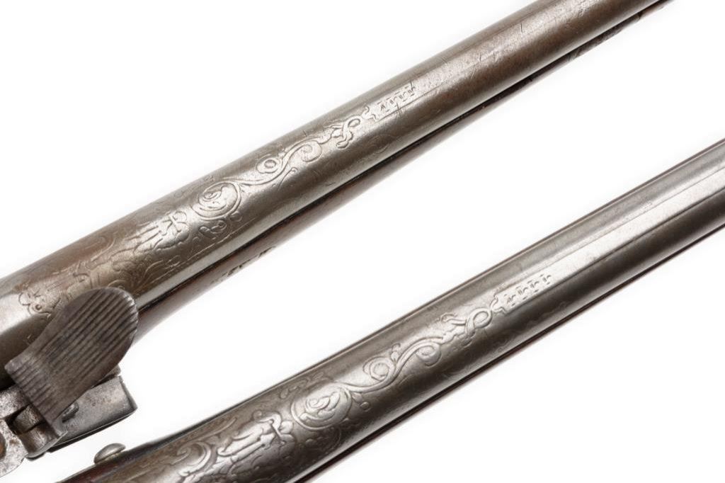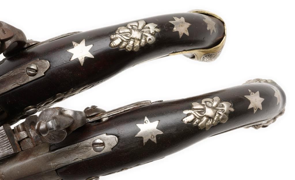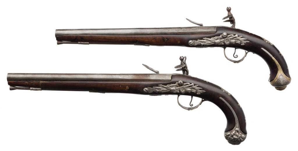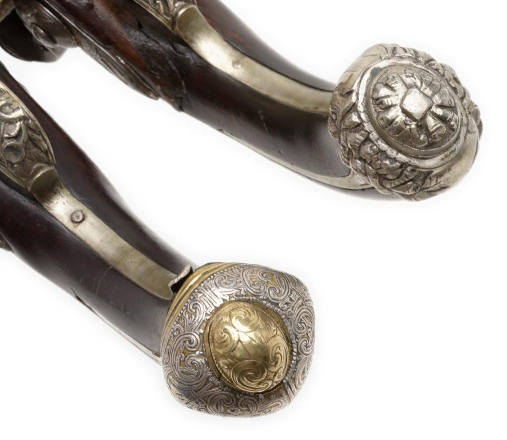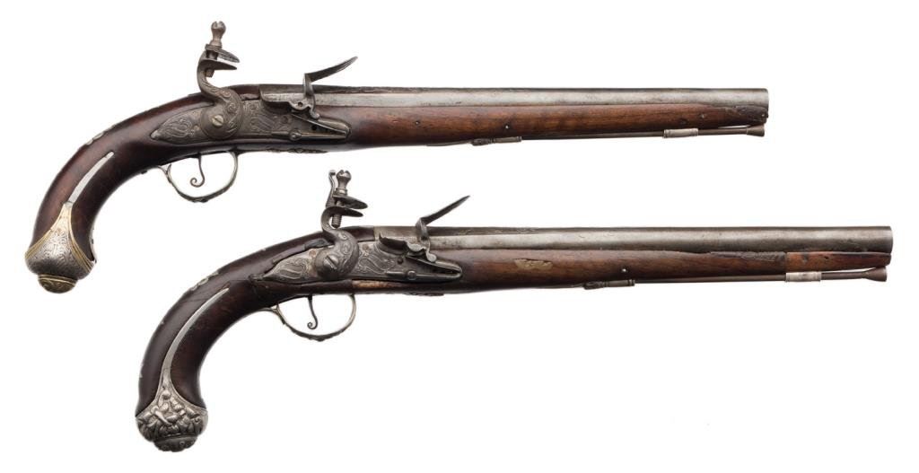 Pair of Continental made flintlock pistols circa late 18th to early 19th century probably Italian made for export to the Middle East. 18 ½” overall with 12 ½” BBL’s of .50 plus caliber. Locks and BBL’s nicely engraved and chiseled. Mounts are a silver alloy and somewhat crude and indistinct in detail. The condition is good for their age with some repairs and normal aging along with small imperfections and minor restorations. Not an exact pair. Est.: $900-$1800