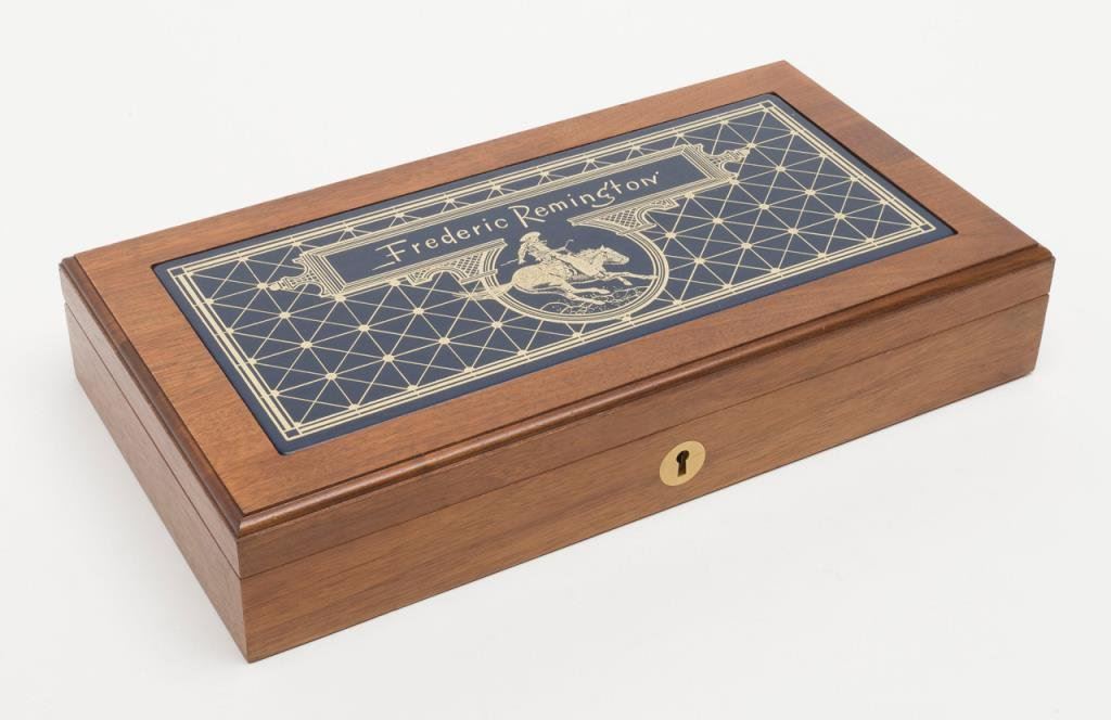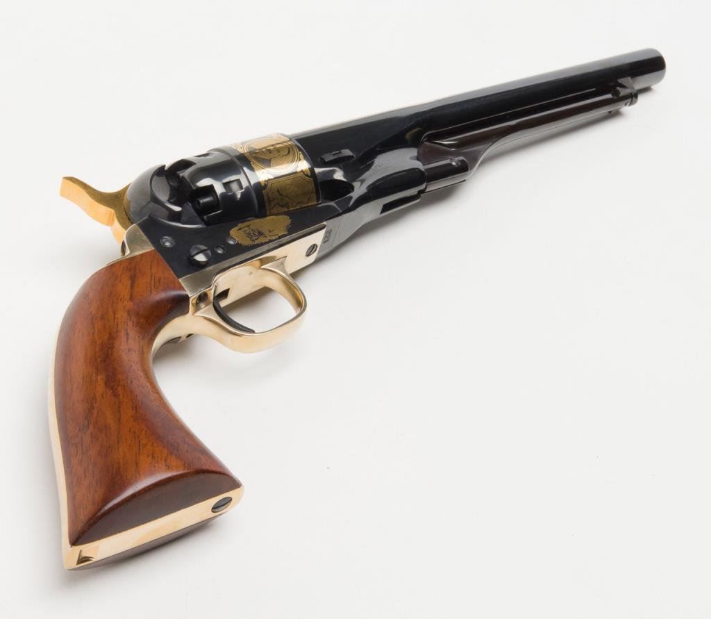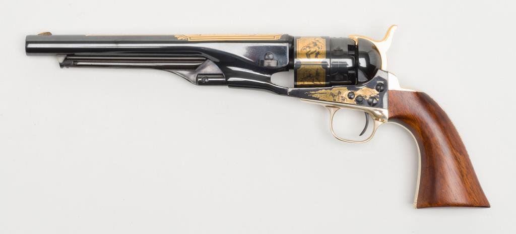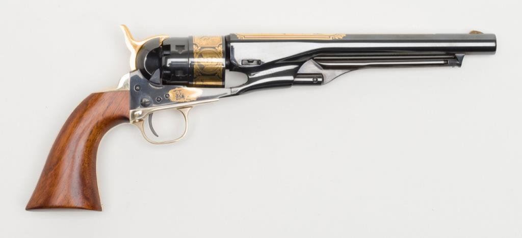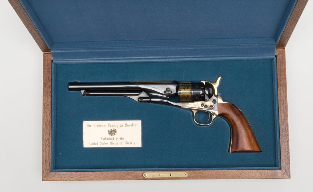 U.S. Historical Society Authorized “The Frederic Remington Revolver”; copy of a Colt Model 1860 Army percussion revolver, .44 cal., 8” barrel, blue finish with gold ornamentation, wood grips, #221 in like new condition showing little handling and accompanied in a beautiful French-lined presentation wood case with leather inset in lid displaying Remington’s name and likeness of one of his bronzes of a cowboy on horseback. (Exempt-Modern percussion). Est.: $800-$1,600.