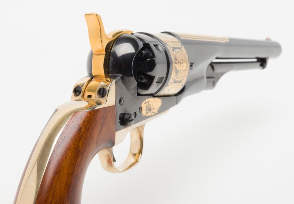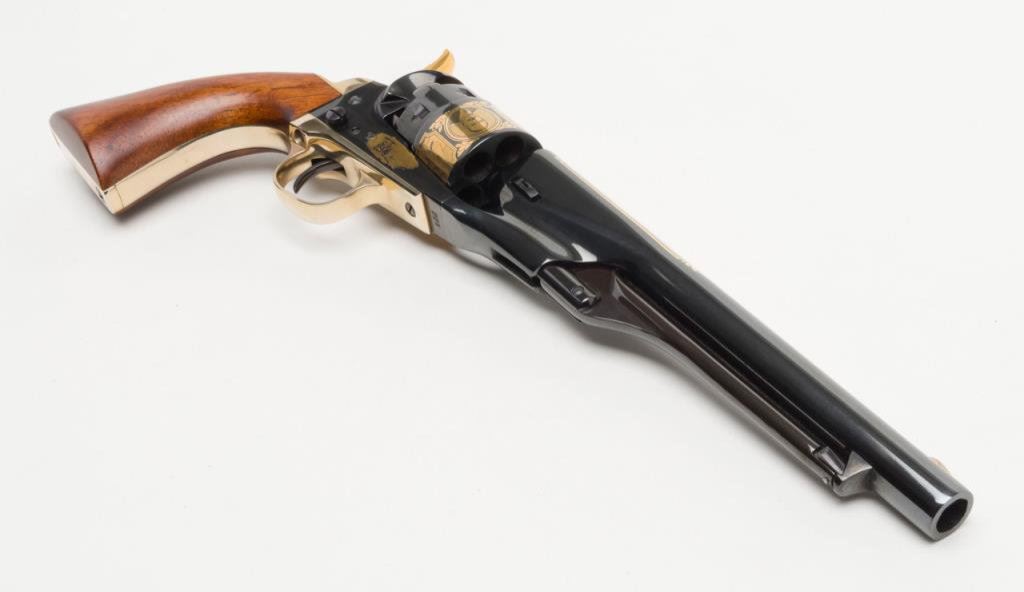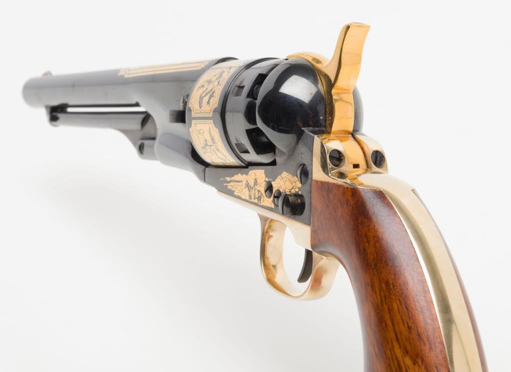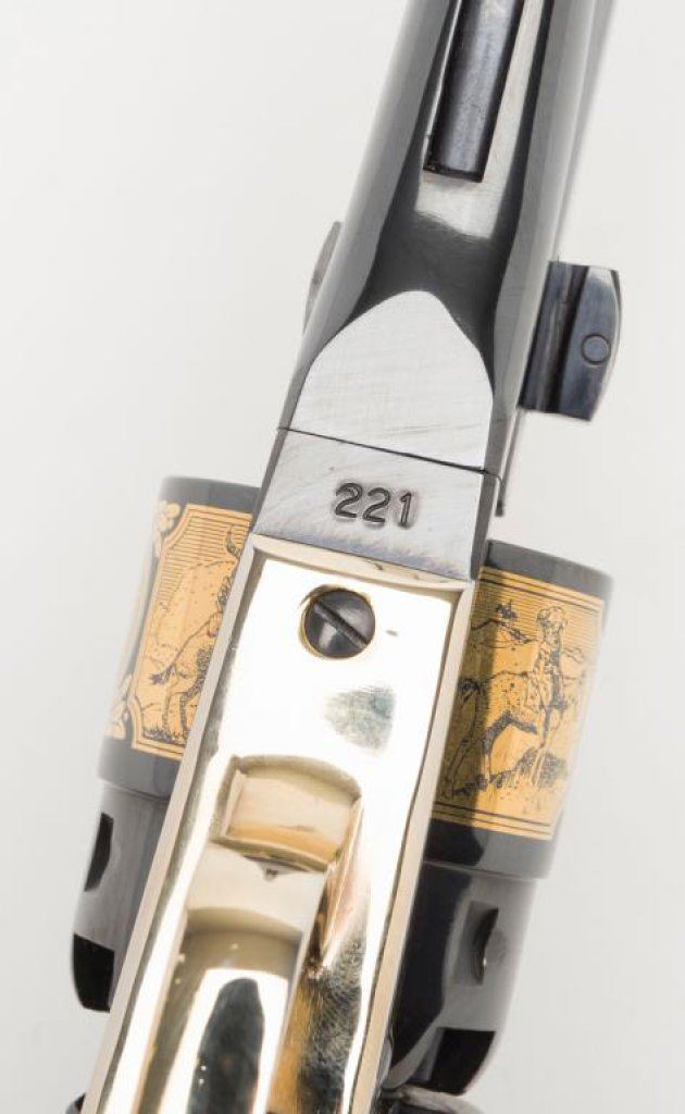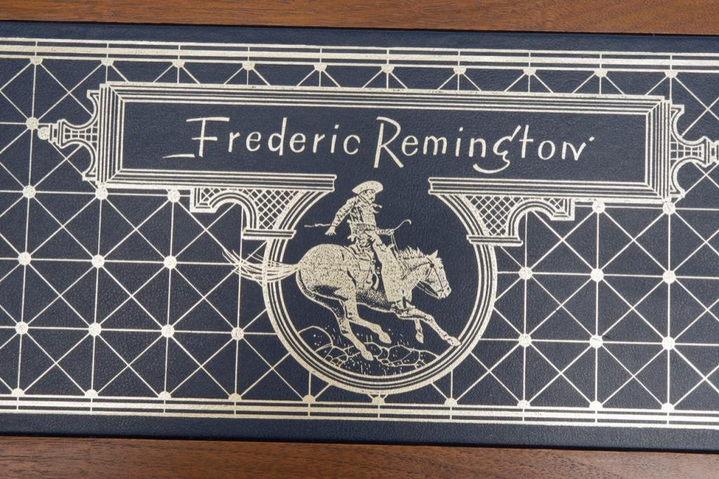 U.S. Historical Society Authorized “The Frederic Remington Revolver”; copy of a Colt Model 1860 Army percussion revolver, .44 cal., 8” barrel, blue finish with gold ornamentation, wood grips, #221 in like new condition showing little handling and accompanied in a beautiful French-lined presentation wood case with leather inset in lid displaying Remington’s name and likeness of one of his bronzes of a cowboy on horseback. (Exempt-Modern percussion). Est.: $800-$1,600.
