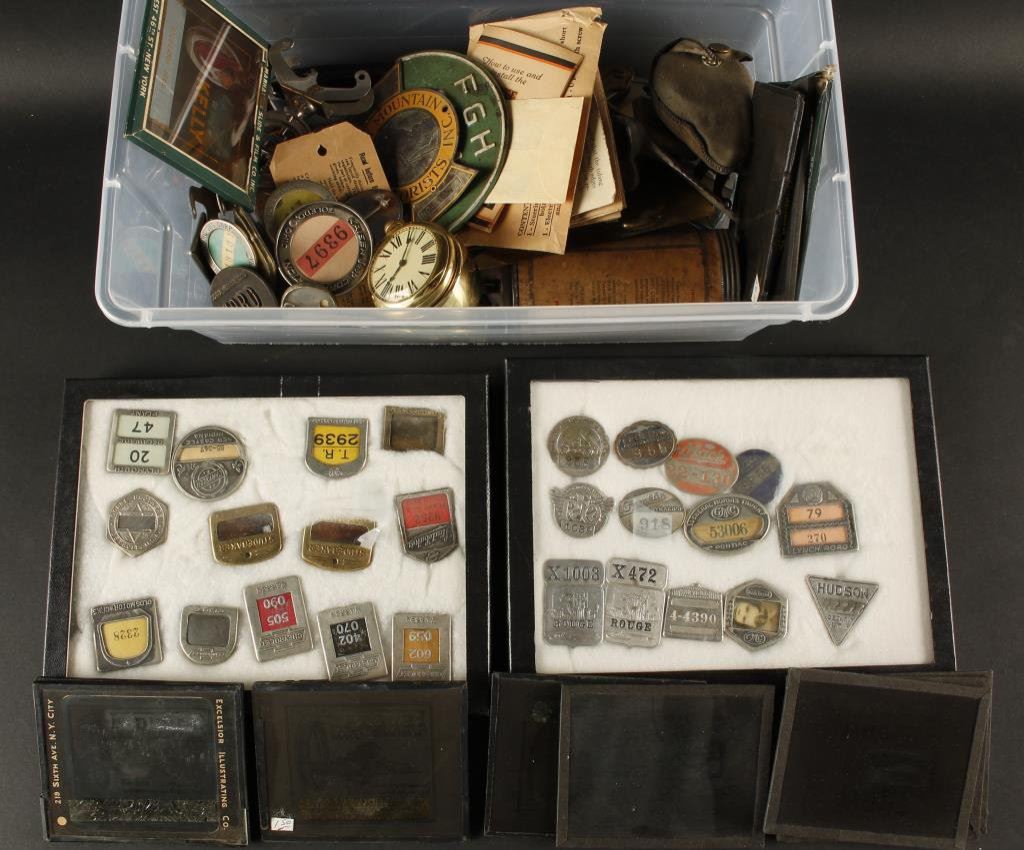 Bonanza lot of badges in 2 riker cases and misc. car memorabilia, mostly pre-war. Est.: $250-$500.