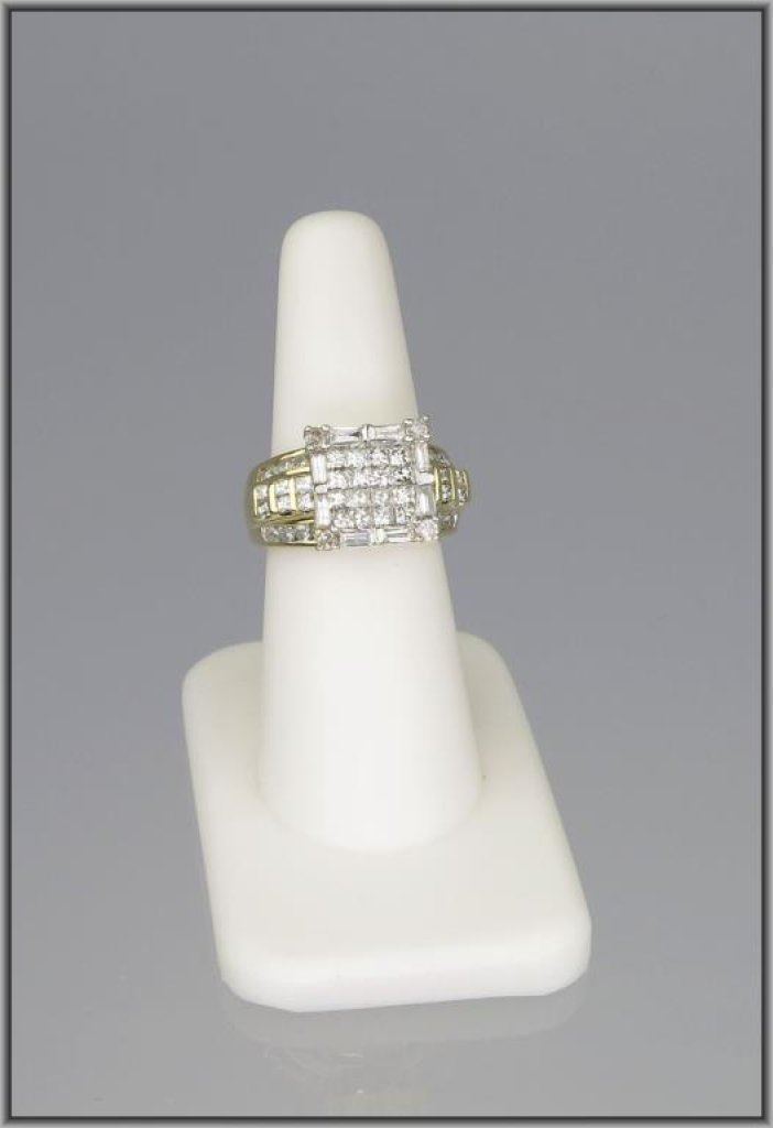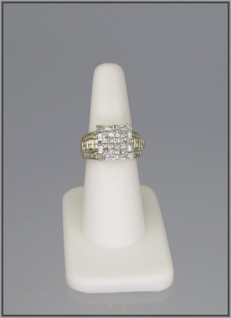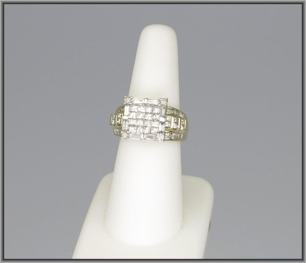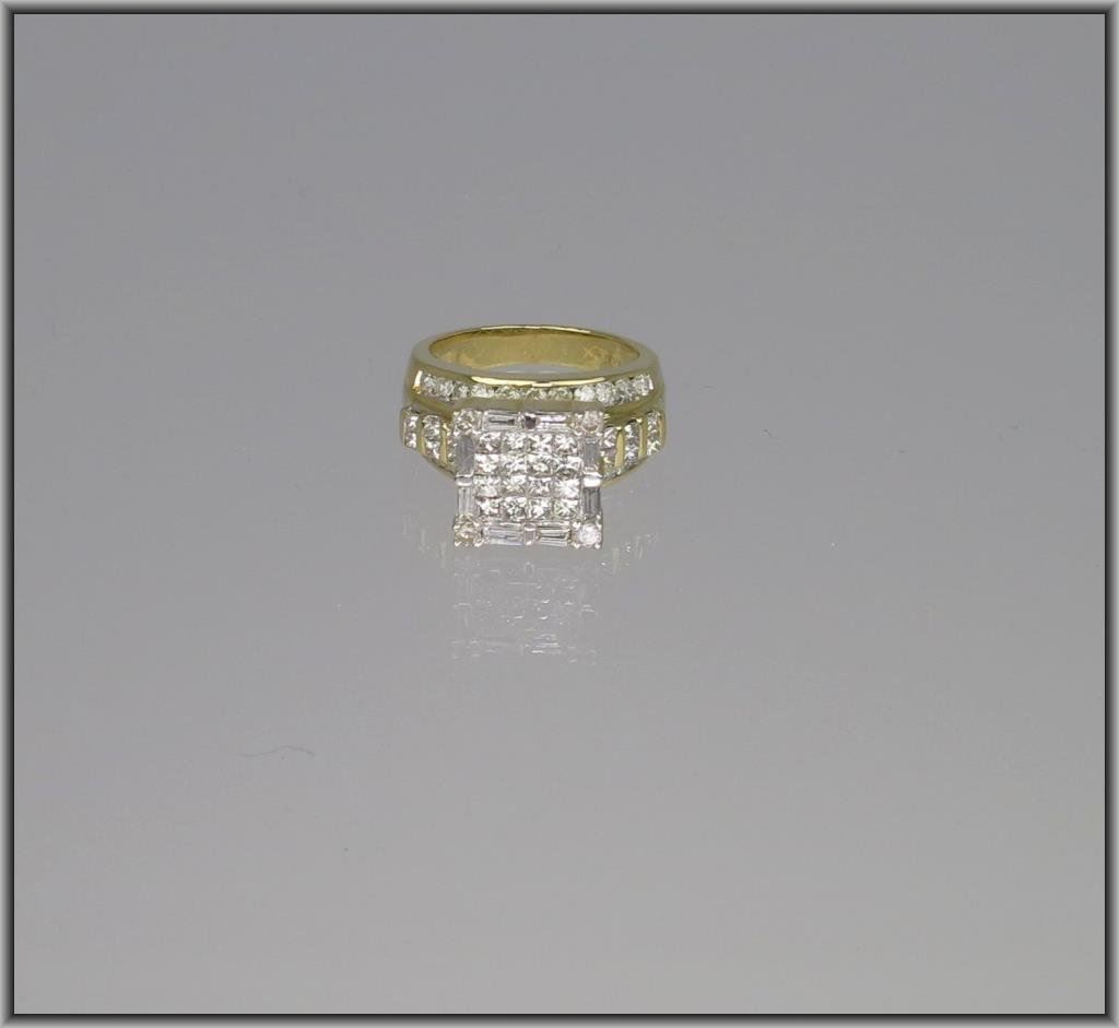 Brilliant Diamond Cocktail Ring with a combination of princess, round and baguette cut Diamonds weighing approx. 2.25-2.50 total with H-I colors and SI clarity set in 9.50 grams of 14 karat yellow gold. Retail $2,500-$3,000 Estimate $1,500-$2,000