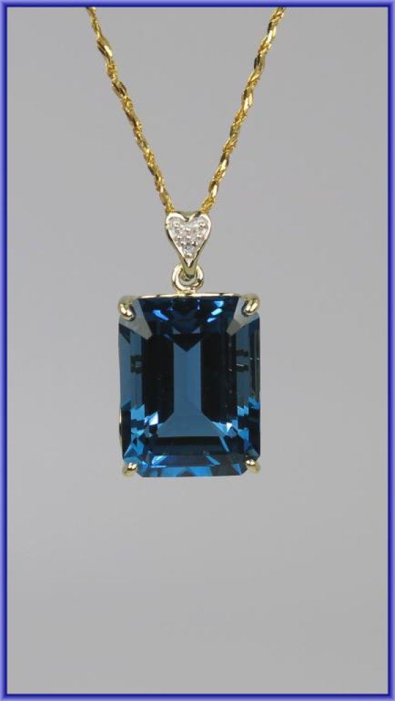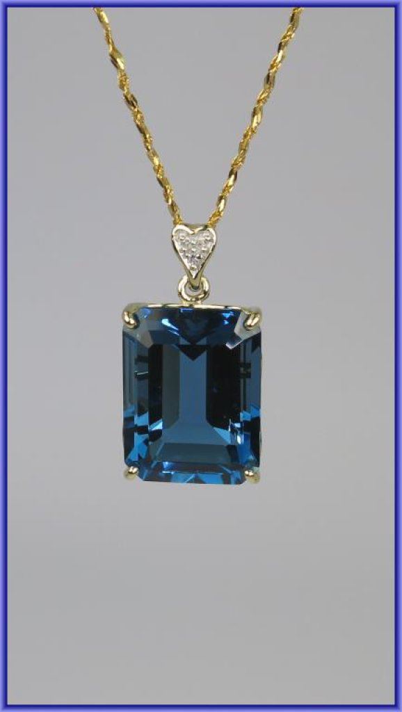 Fantastic 27.15 carat London Blue Topaz and Diamond Pendant featuring an emerald cut blue topaz with rich blue color and VS clarity accented with heart shaped Diamond accent set in 14 karat yellow gold with 14 karat yellow gold Italian made chain. NEW Piece. Retail $2,200-2,600 Estimate $1,200-$1,400