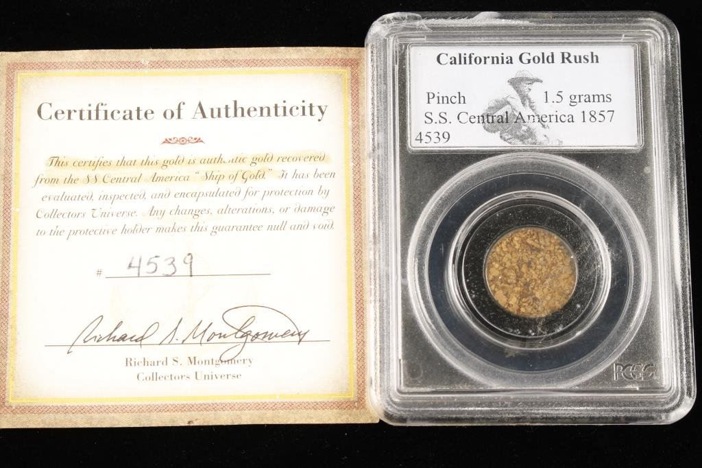 Pinch of gold dust (1.5 Grams) in holder from Collector’s Universe off a ship wreck of the S.S. Central America (1857 California gold rush- sunk while transporting gold from the gold fields) with certificate. Est.: $200-$400