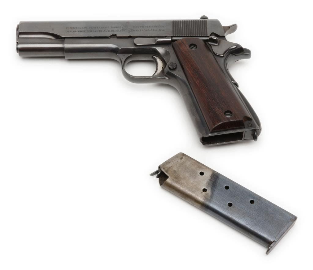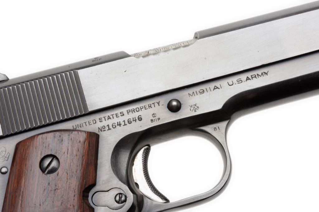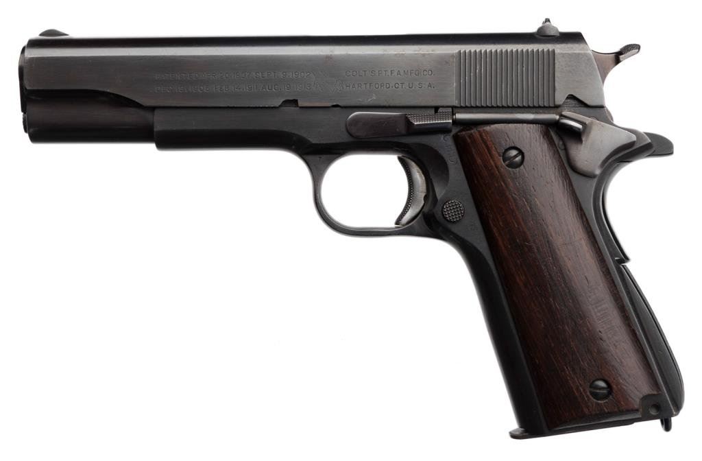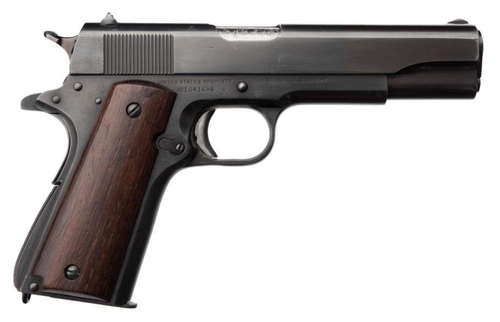 **U.S. Property marked Colt Model 1911-A1 semi-auto pistol, British proofed, .45 caliber, 5” barrel, S/N 1641646, re-blued finish, smooth wood grips in overall very good condition as restored displaying the majority of an old refinish, very good bore, crisp action, very good grips. Est.: $700-$1,400.