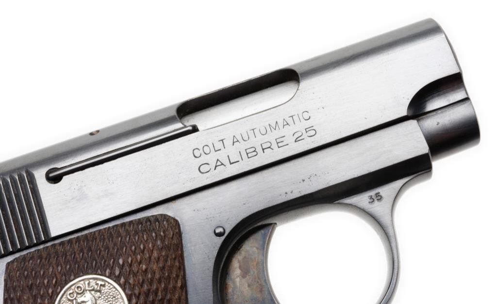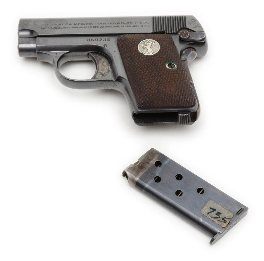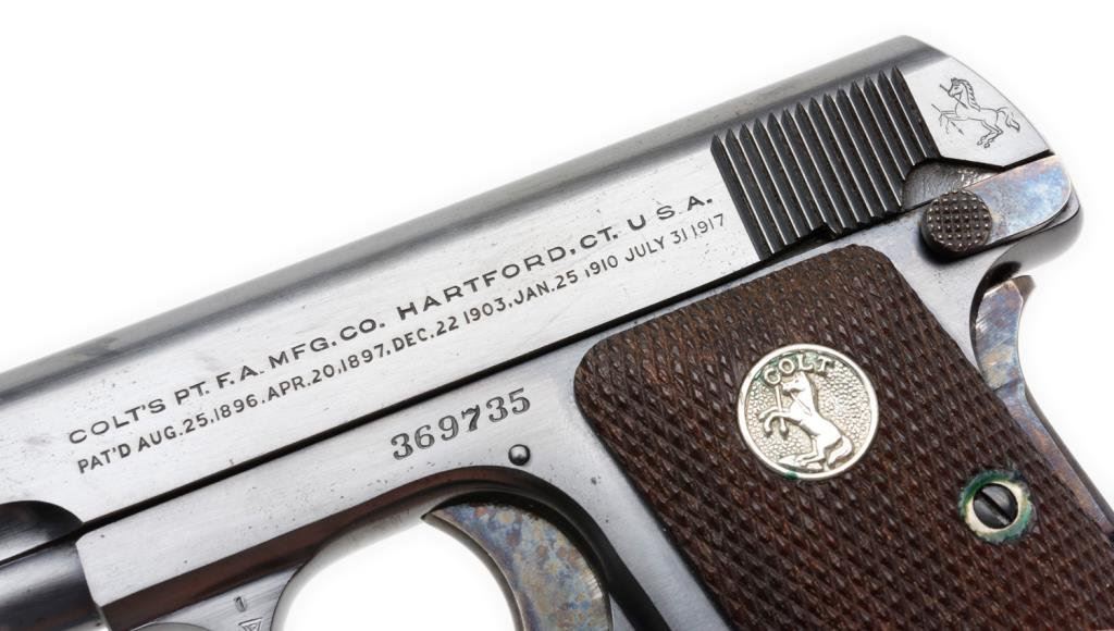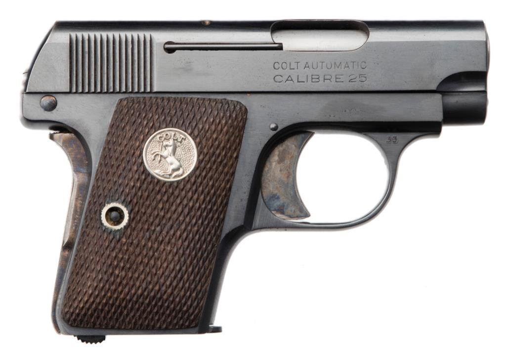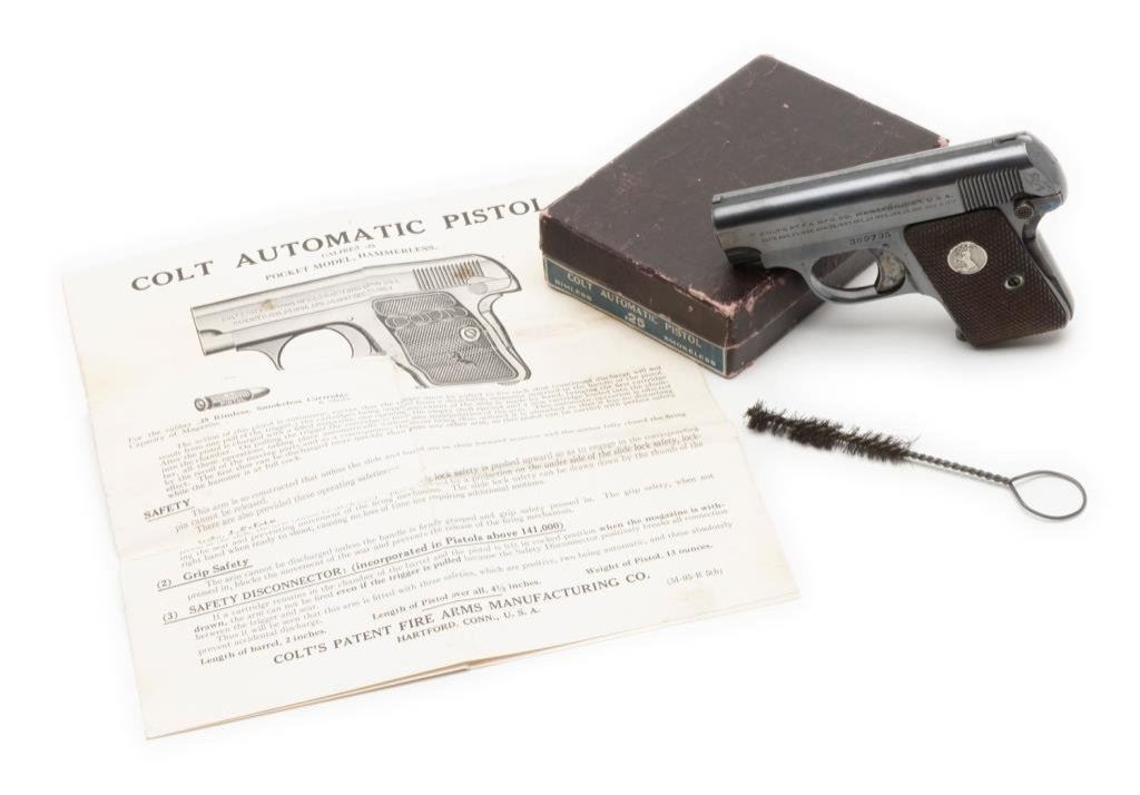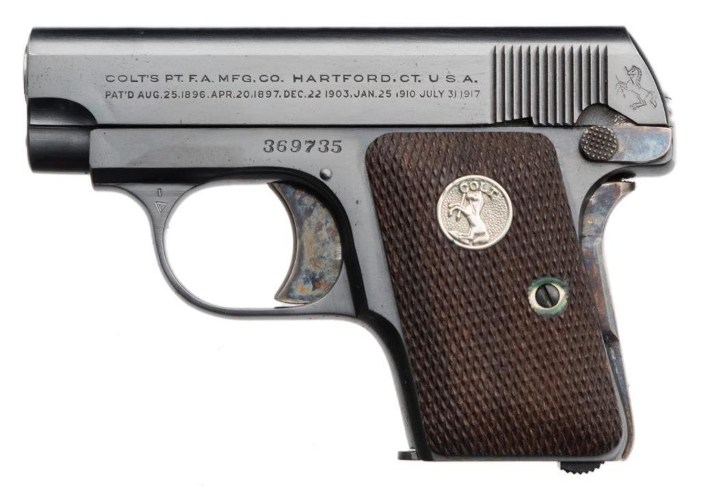 **Colt Model 1908 semi-automatic pistol, .25 caliber, 2” barrel, S/N 369735, blued finish, checkered wood medallion grips in overall fine to excellent condition showing little use or handling; two-tone magazine, crisp action and markings, very good bore and fine grips. Accompanied by a factory brown covered cardboard box with correct end label, cleaning brush and instructions. Est.: $900-$1,800.