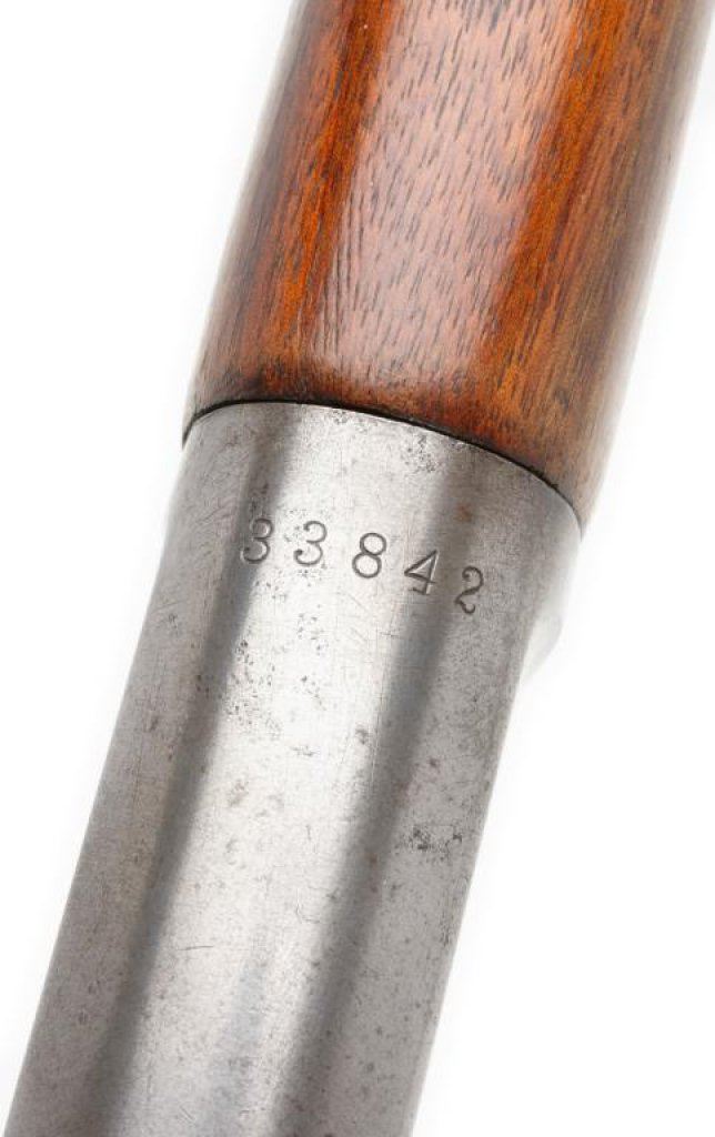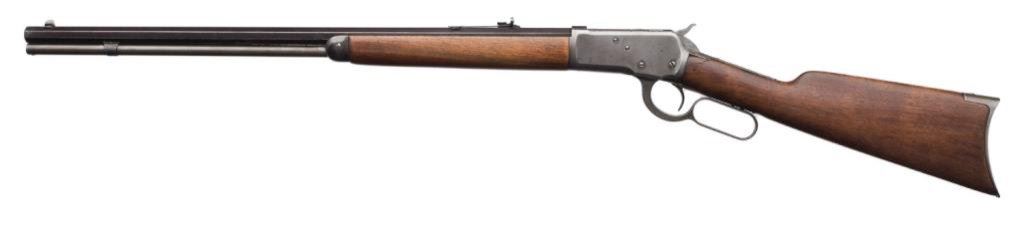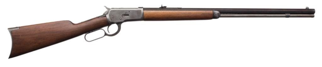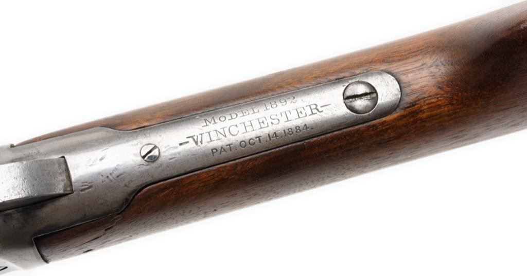 *Winchester 1892 lever action rifle, .32-20 WCF cal., serial #33842. The rifle is in overall good condition with a 24” blued octagon barrel with replacement front and rear sights. The barrel retains approximately 60% of its blued finish and the magazine shows light surface rust. The receiver has been cleaned leaving an overall silver/grey appearance. The smooth wood stocks have been sanded with the fore end receiving an extra coat of varnish. There are chips on both sides of the tang and the metal crescent butt plate is slightly proud at the toe. The bore is very good, the action crisp and markings are legible on this antique Winchester made in 1893. Est.: $600-$1,200.